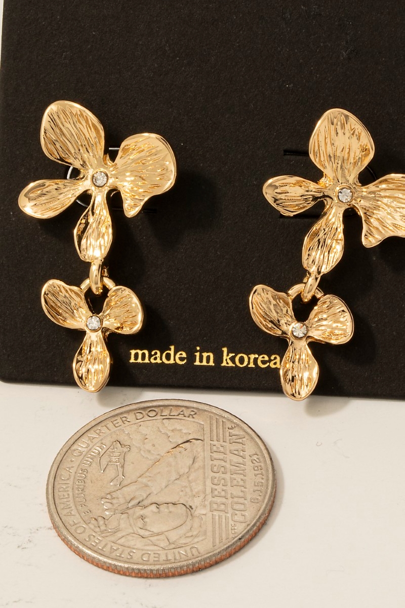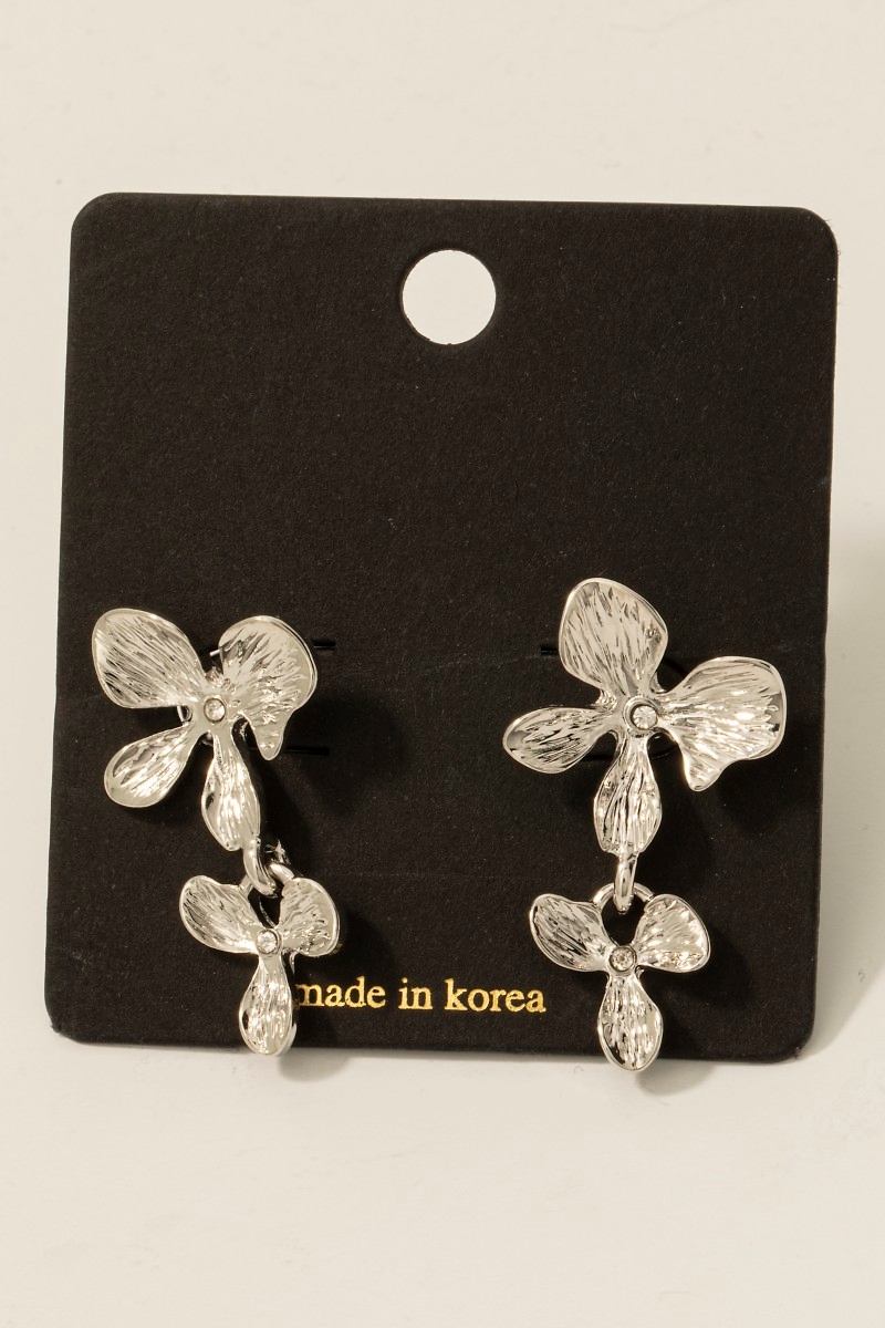 - This pair of dangle earrings features a fashionable textured double flower style. Embark on a journey of sartorial refinement as this pair of dangle earrings effortlessly complements your fashion sense.