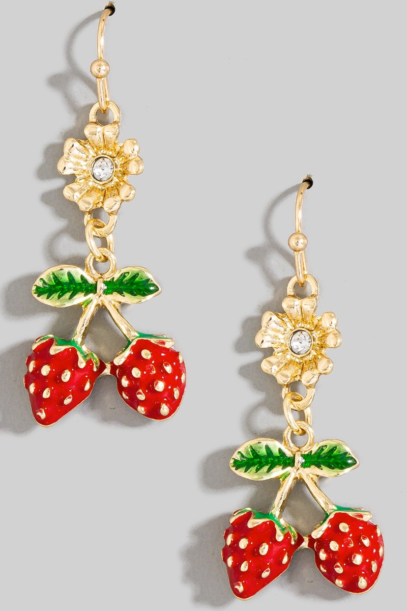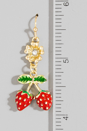 • This pair of dangle earrings features a fashionable flower and strawberries enamel style. Celebrate the art of accessorizing with this piece that effortlessly encapsulates modern trends.