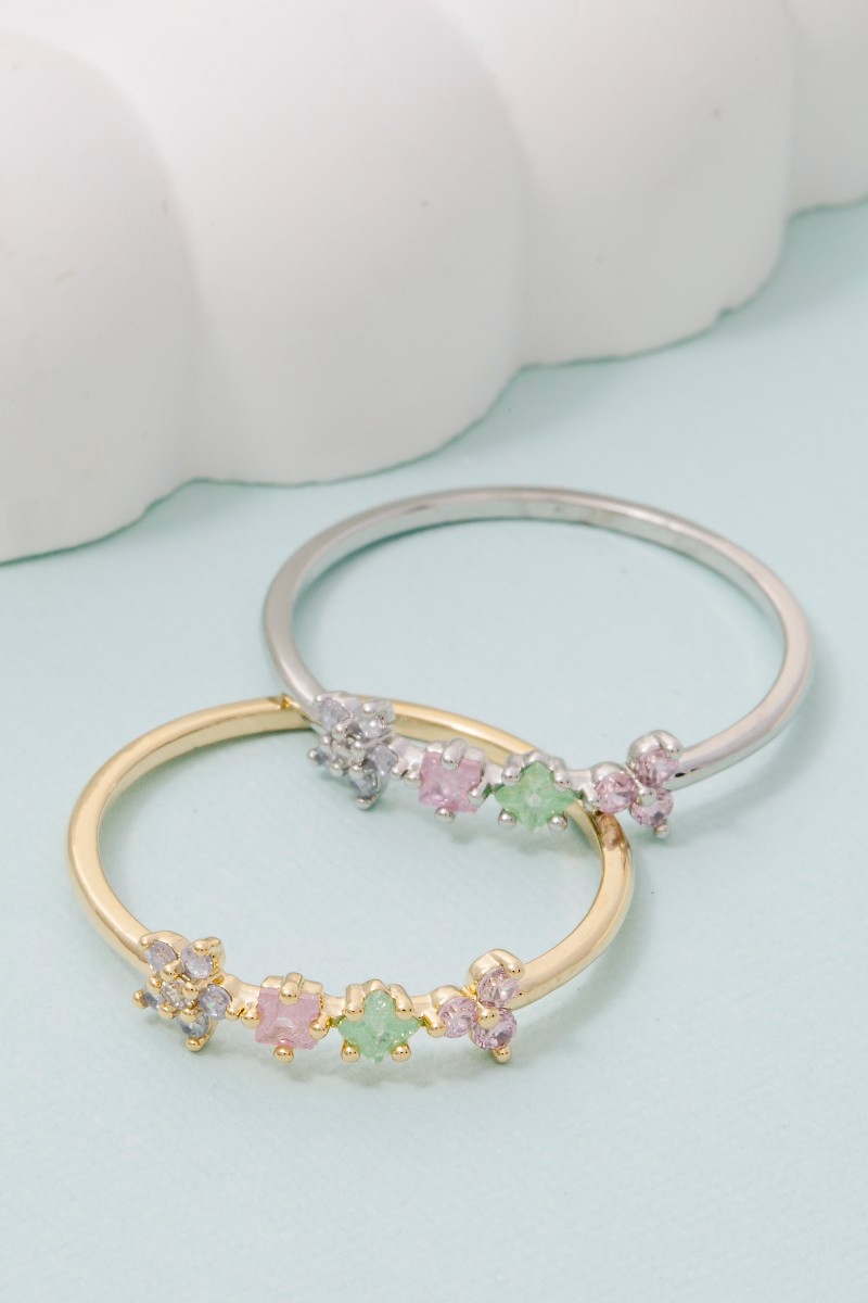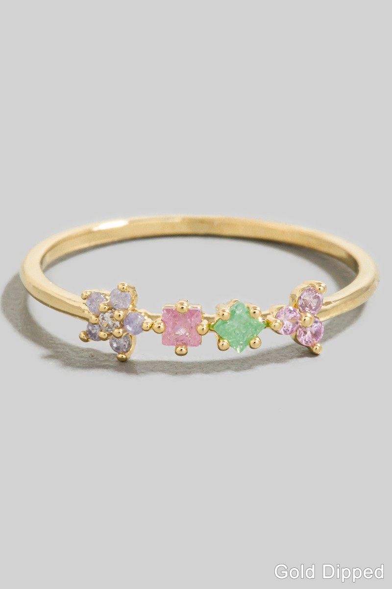 • This ring adds a modern gold dipped assorted cubic zirconia flower style. Unveil modern elegance with this subtly intricate ring.