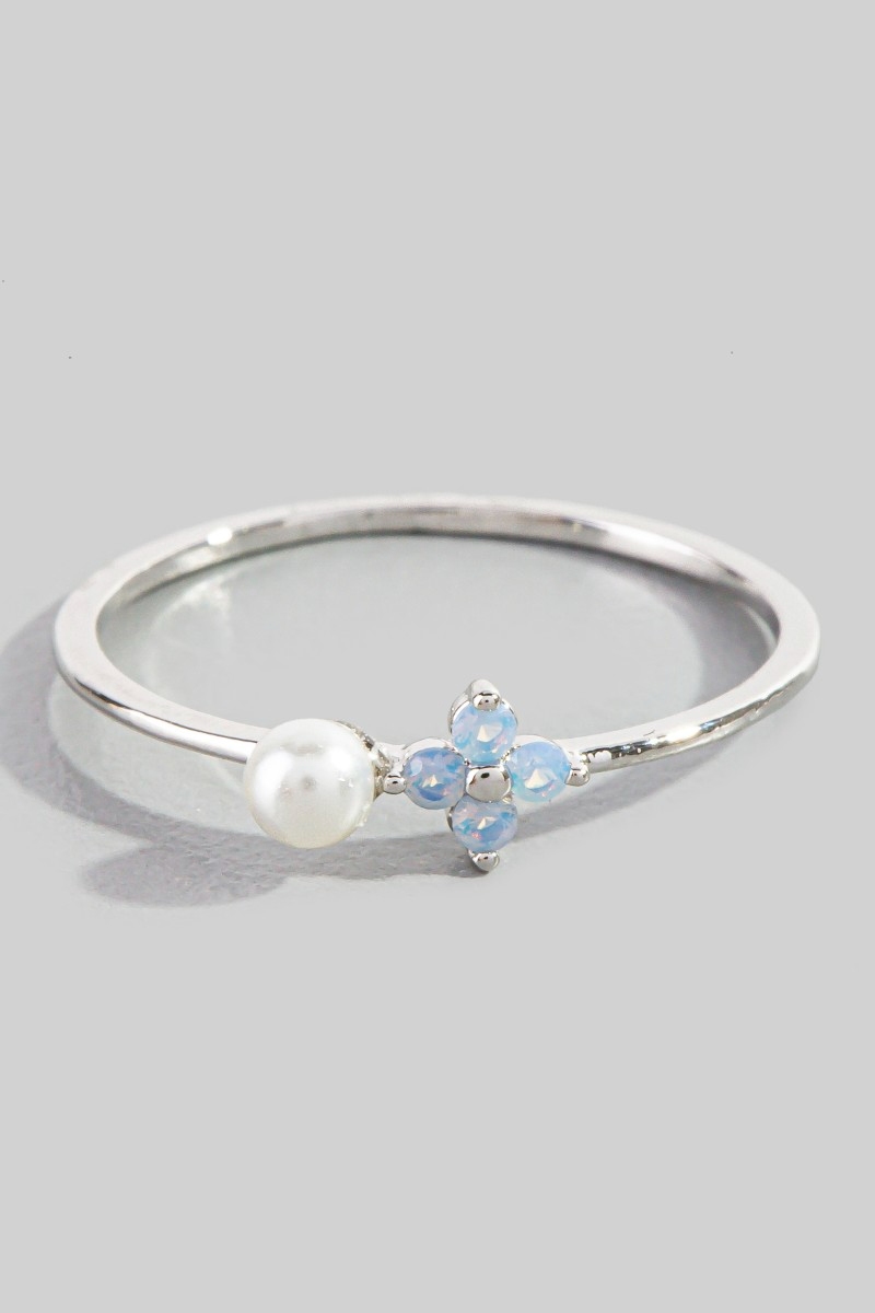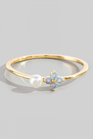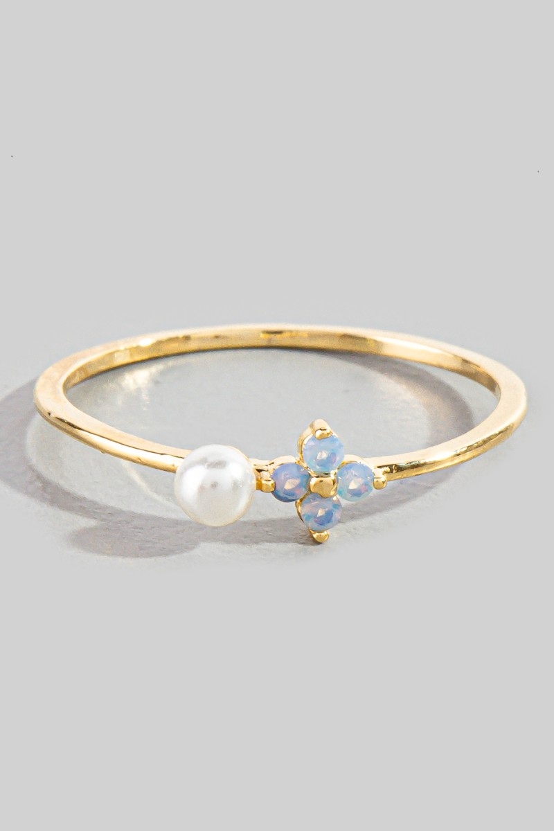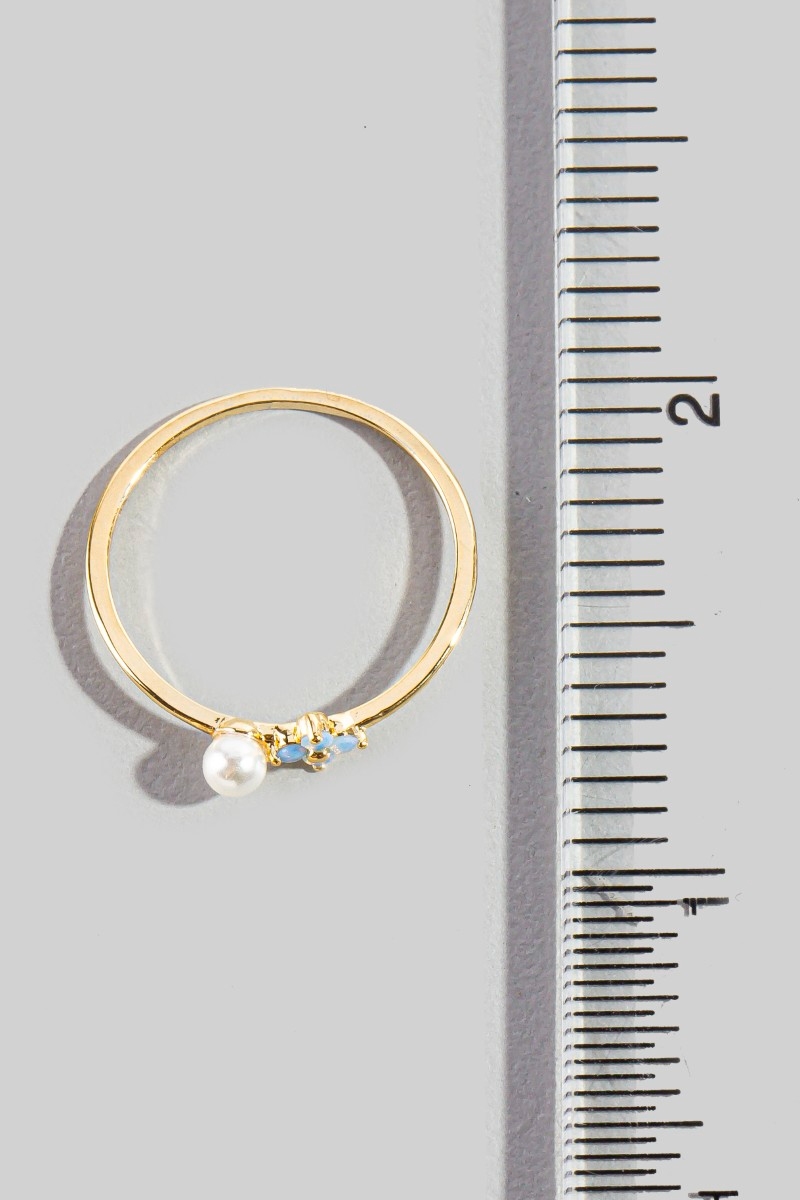 • This ring displays a fashionable gold dipped cubic zirconia cluster and glass pearl style. Immerse yourself in the details of design, as this ring effortlessly becomes a conversation starter.