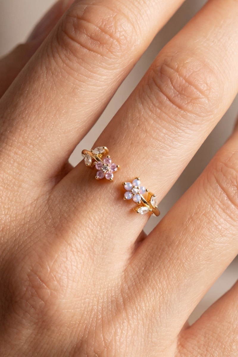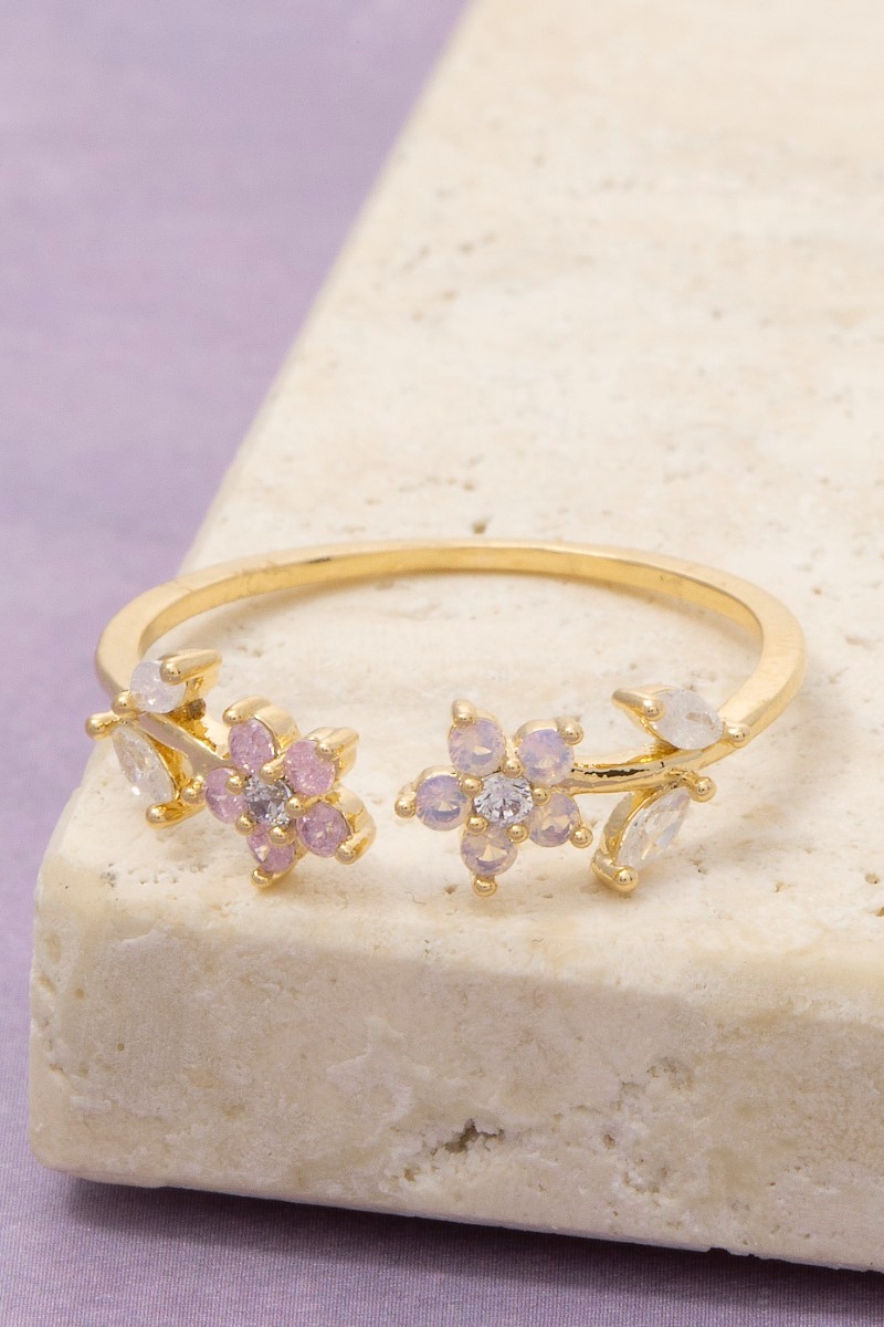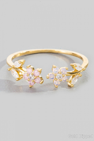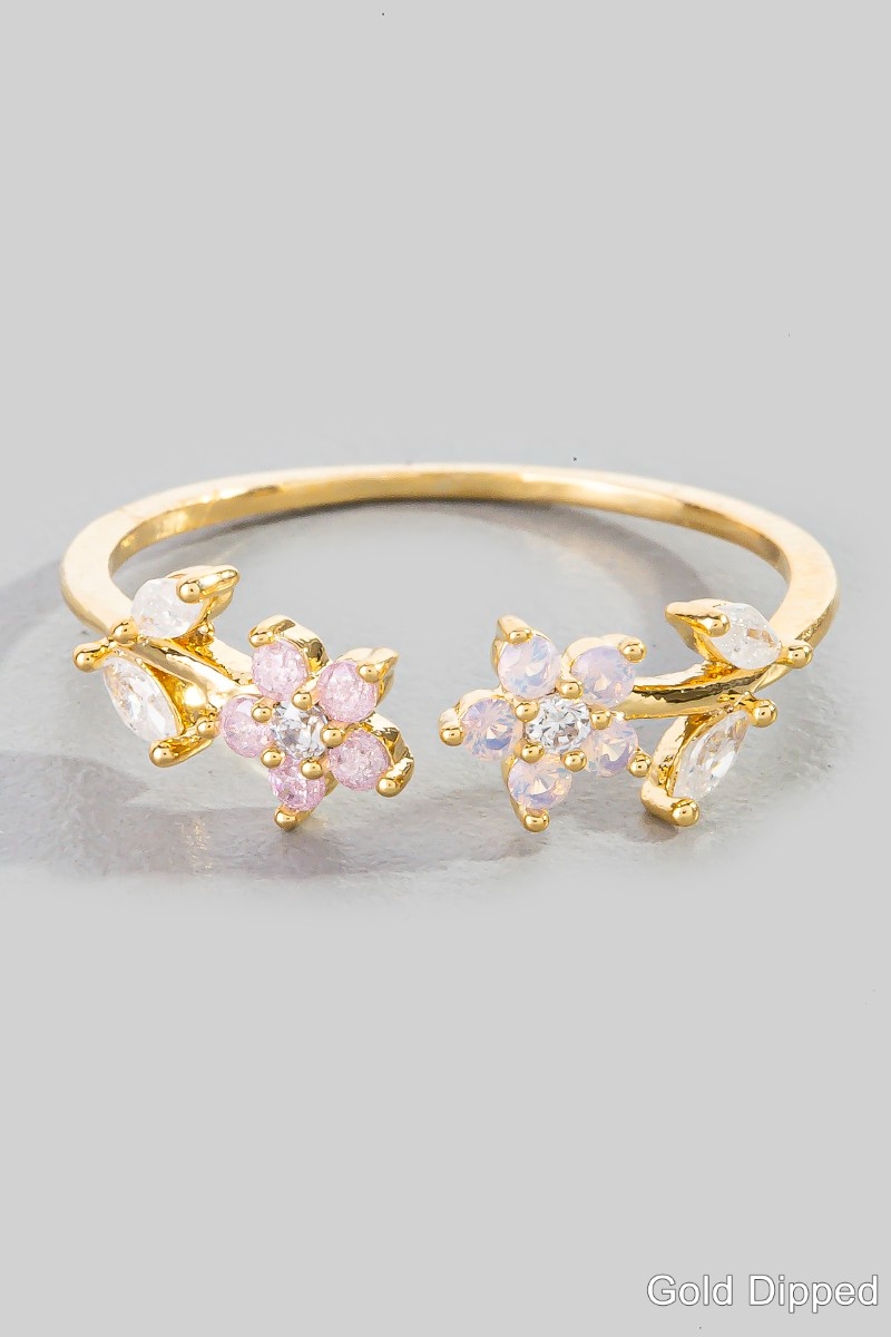 - This ring displays a vibrant gold dipped cubic zirconia double flower open style. Unveil a new dimension of sophistication as this ring effortlessly enhances the elegance of your ensemble.