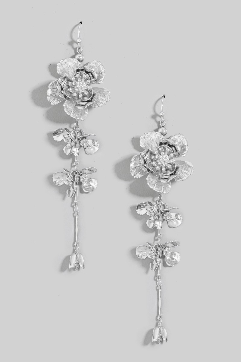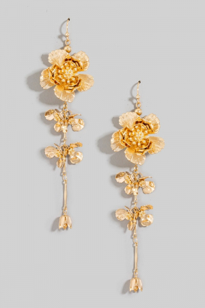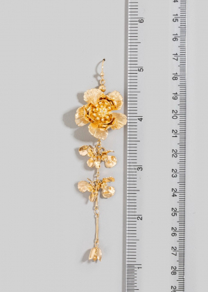 • This pair of dangle earrings features a fashionable metallic flower chain style. Indulge in the allure of exquisite craftsmanship as this pair of dangle earrings effortlessly adds a touch of luxury to your attire.