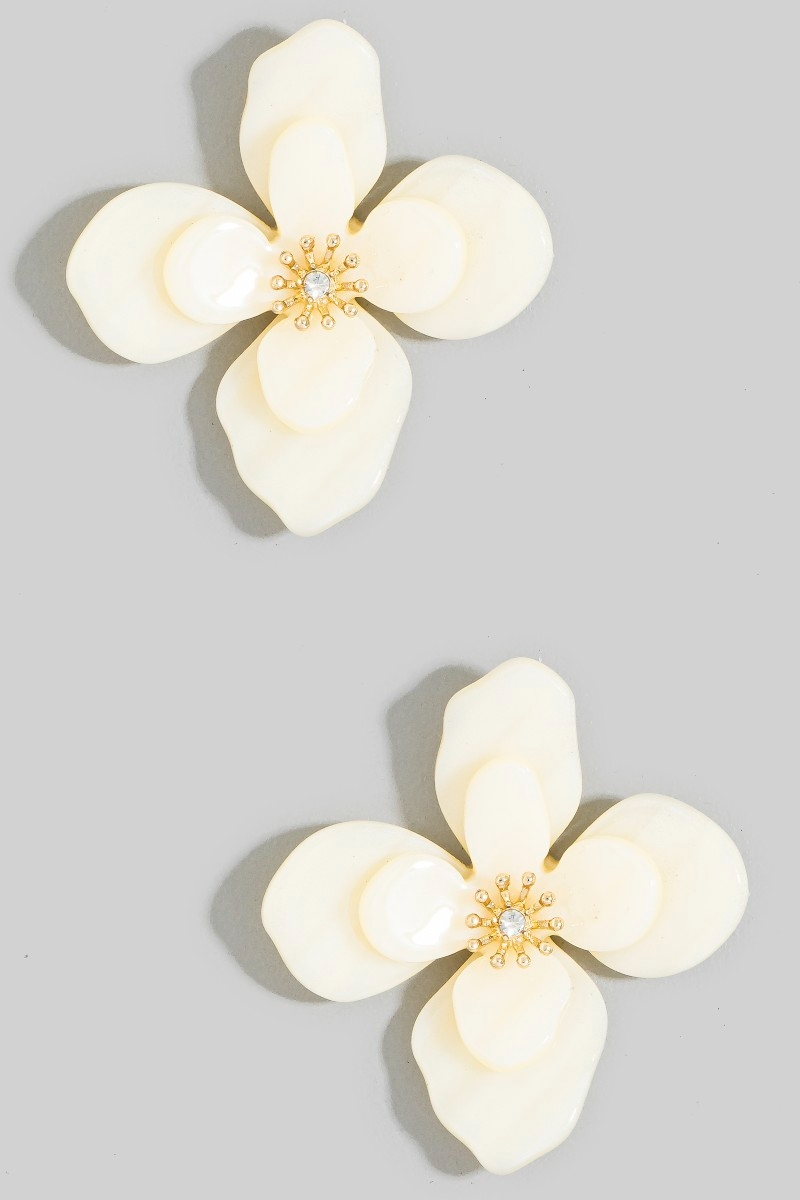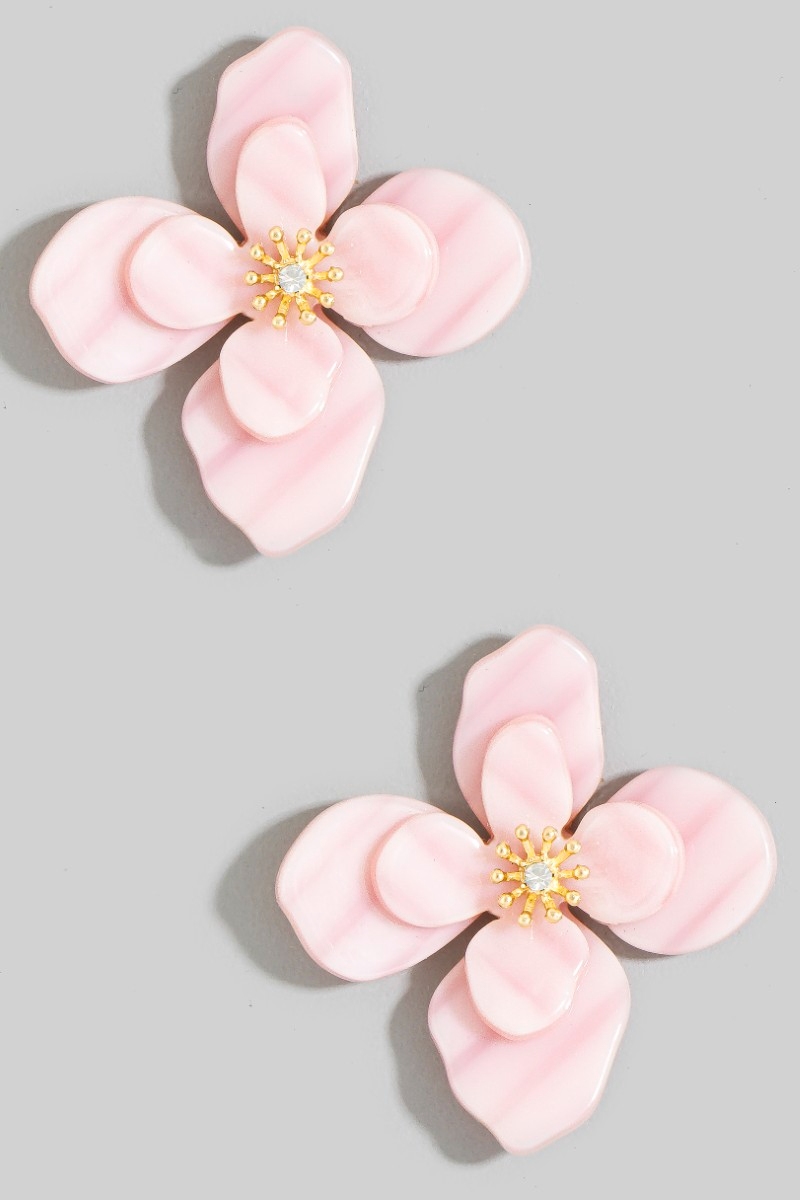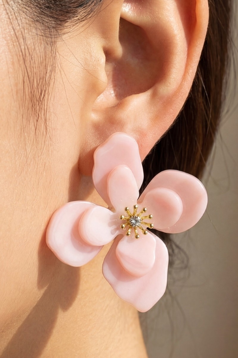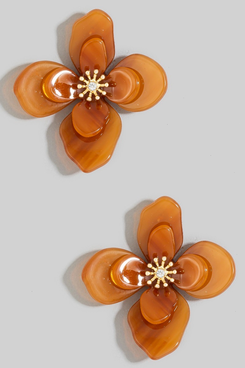 - This pair of stud earrings introduces a unique resin flower style. Revel in the intricate design that effortlessly distinguishes this pair of stud earrings, making it a statement piece.