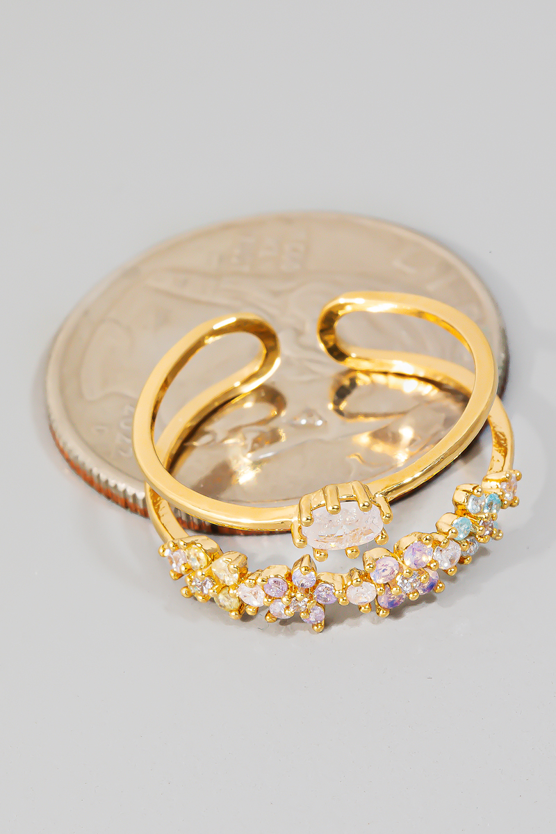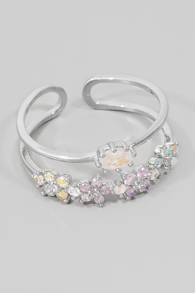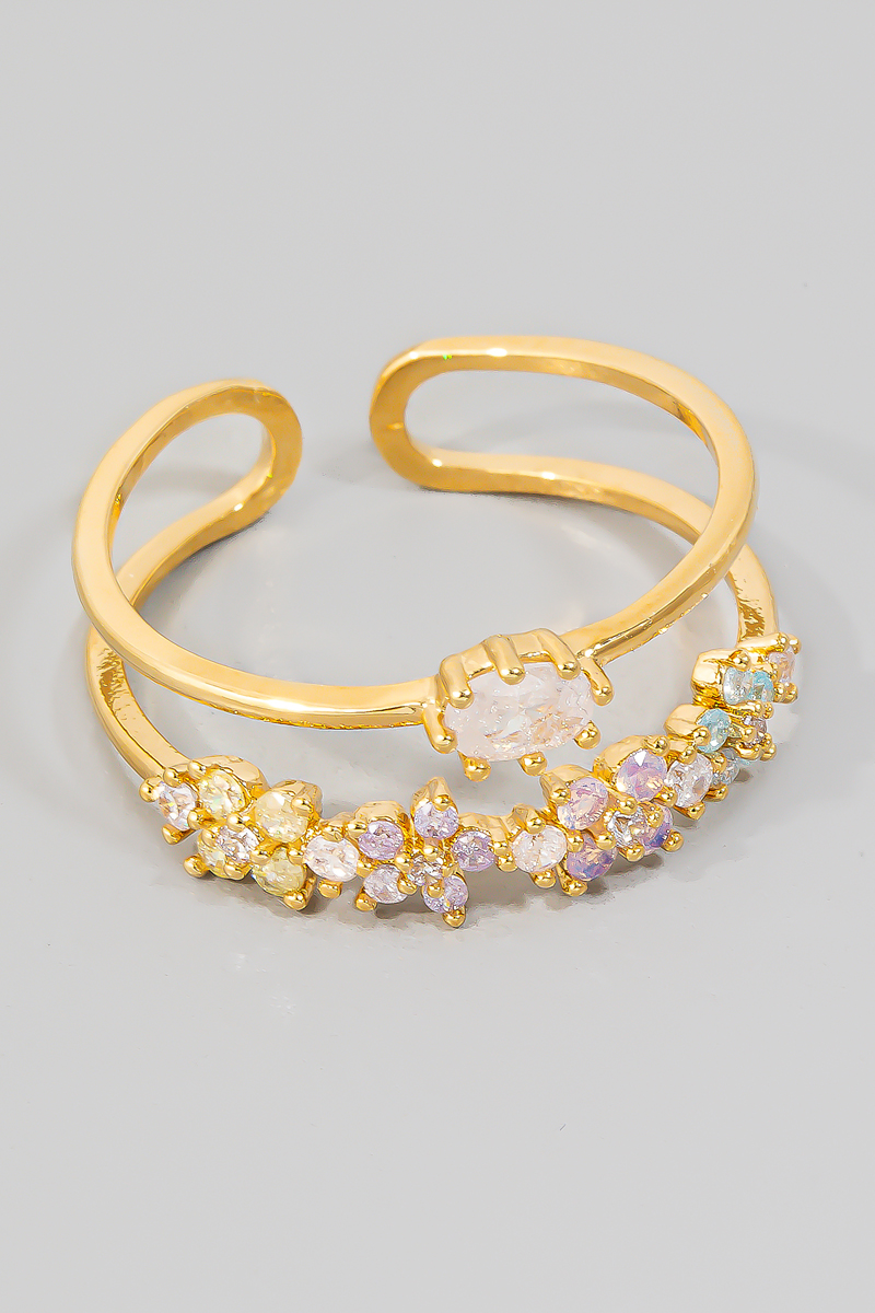 • This ring showcases a unique colorful cubic zirconia flowers layered open band style. Experience the joy of accessorizing with this piece that effortlessly combines versatility and charm.