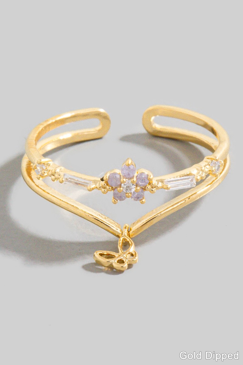 - This ring showcases a timeless cz flower and butterfly gold dipped style. Experience refined sophistication with this understated yet stylish piece.