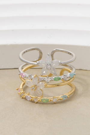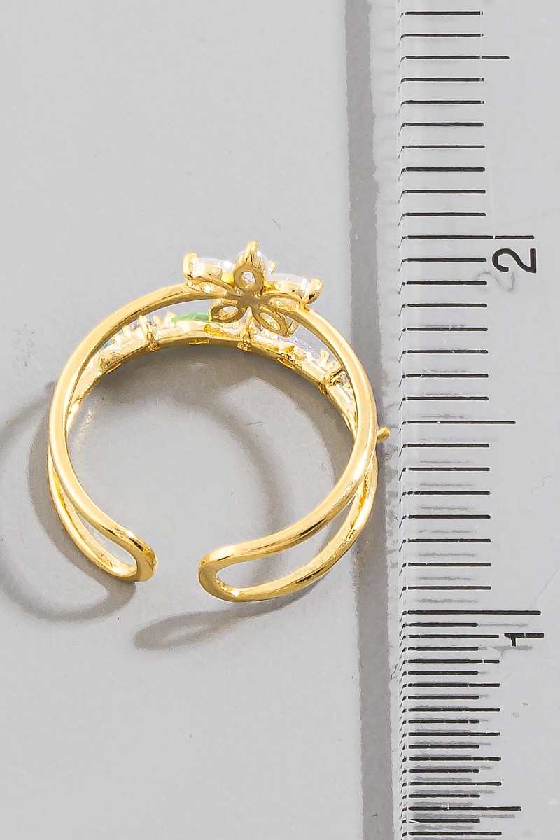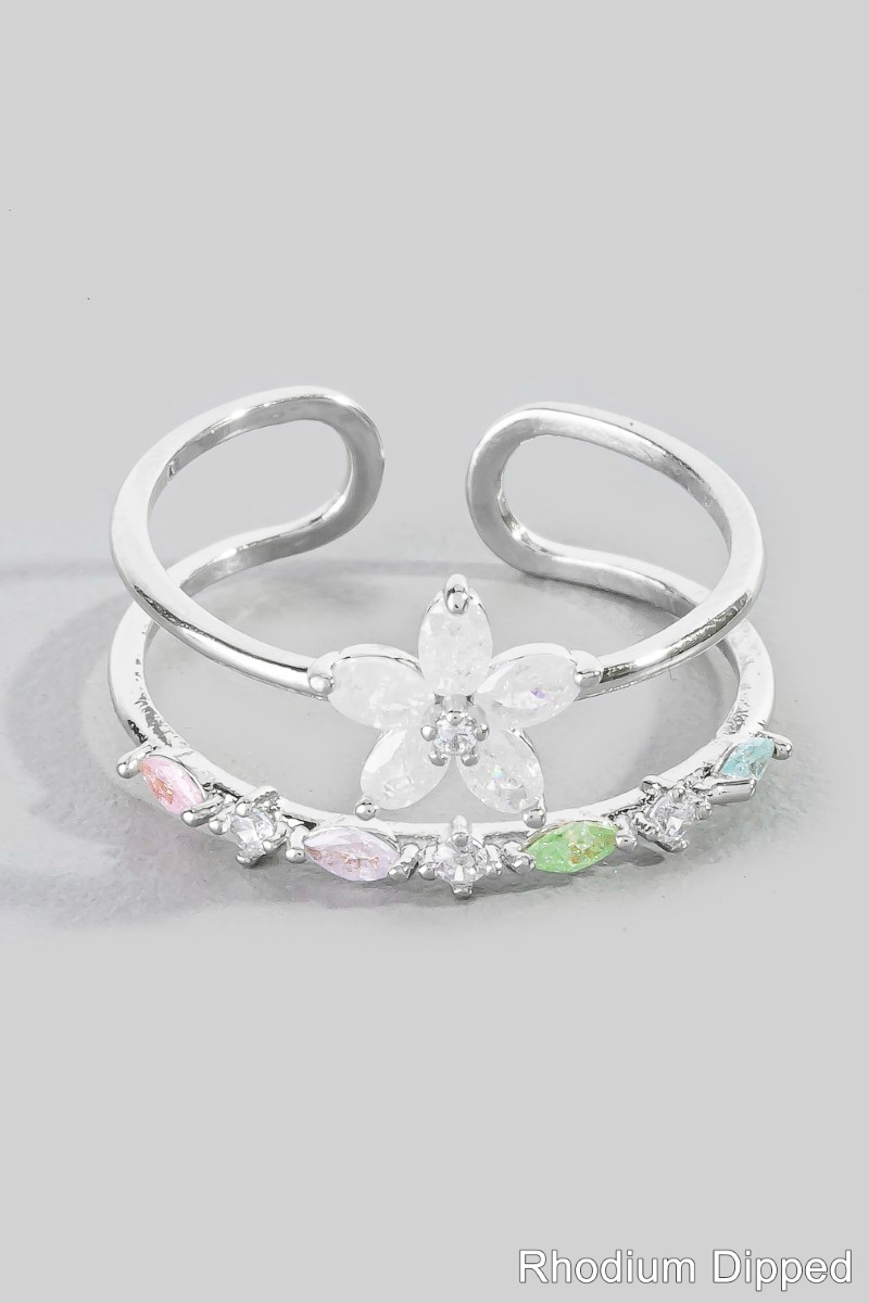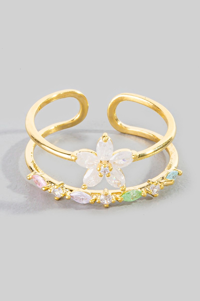 - This ring introduces a unique gold dipped cubic zirconia flower studded two row style. Delight in the intricate details that make this ring an essential element in expressing your fashion identity.