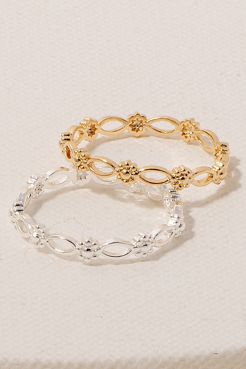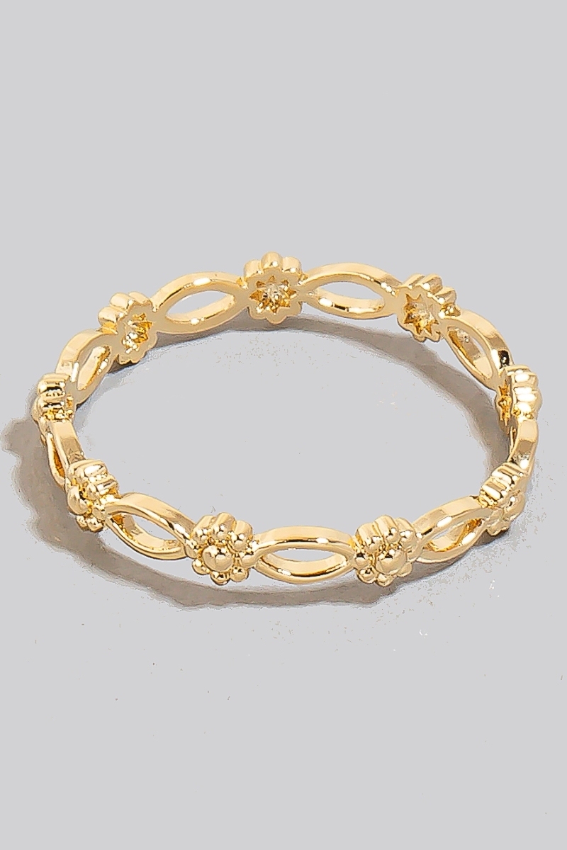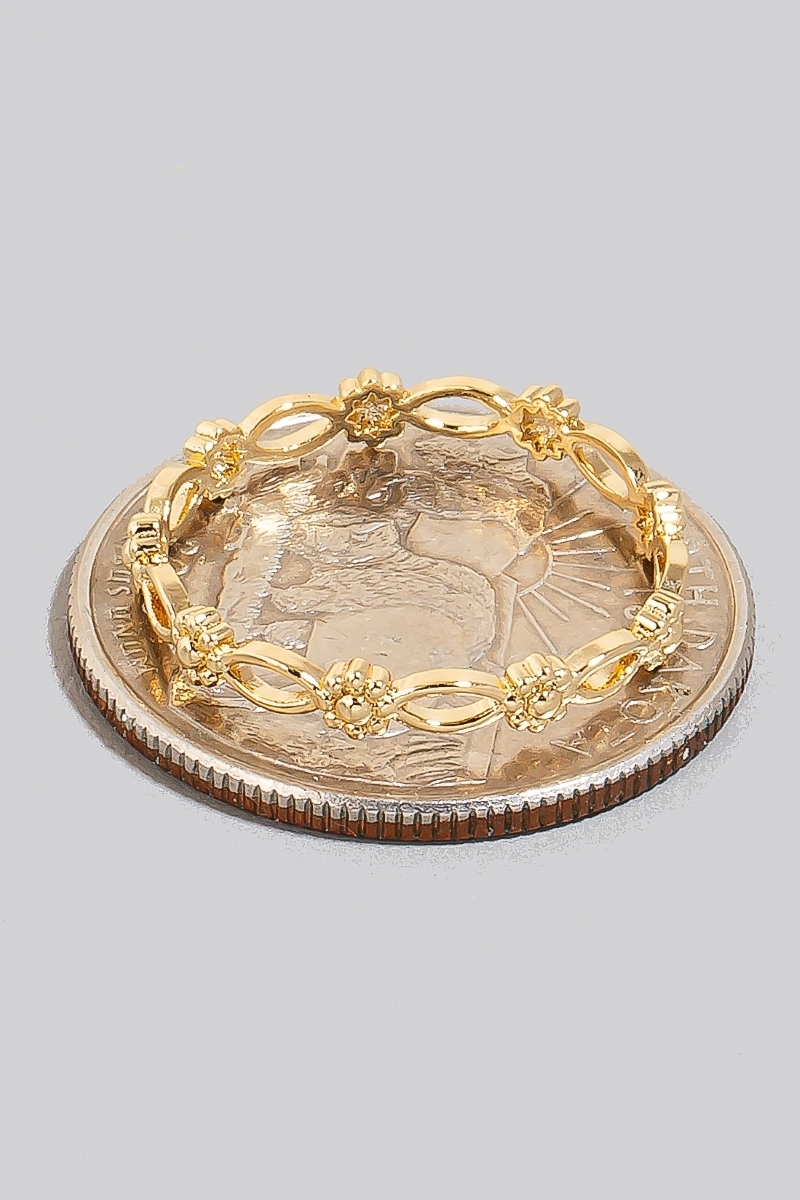 • This ring introduces a unique metallic oval and flower station band style. Step into a world of refined taste as this ring effortlessly refines the details of your outfit.