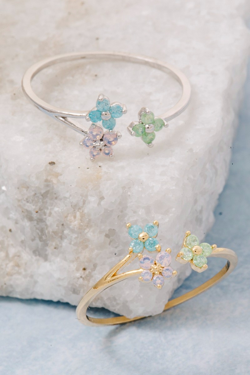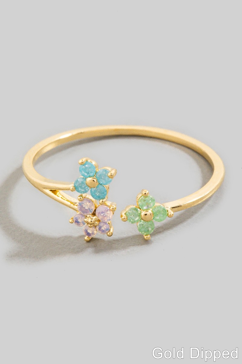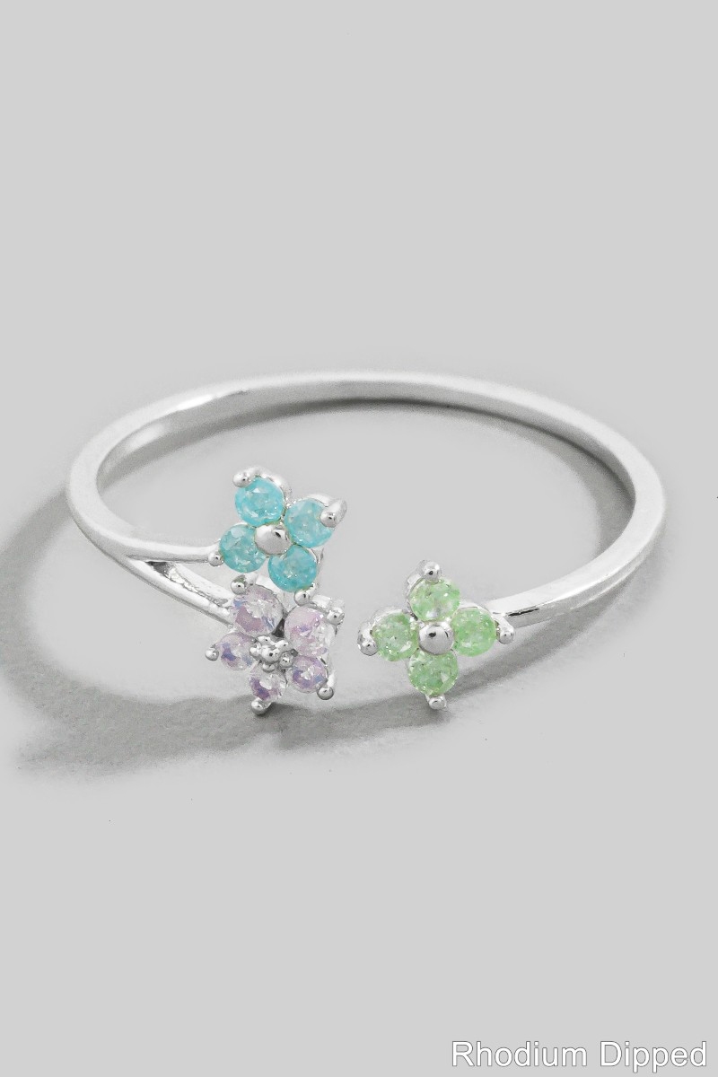 • This ring introduces a unique triple mini cubic zirconia flowers open band style. Step into a world of refined taste as this ring effortlessly refines the details of your outfit.