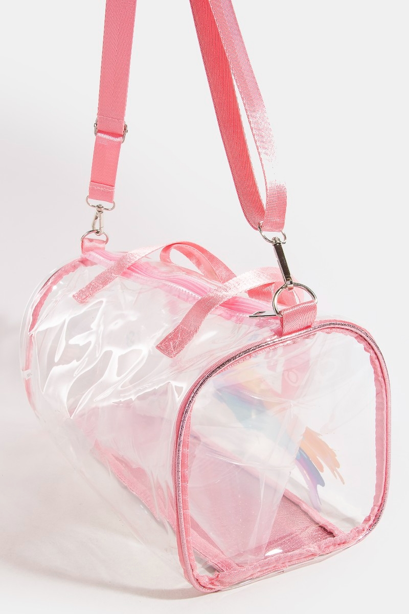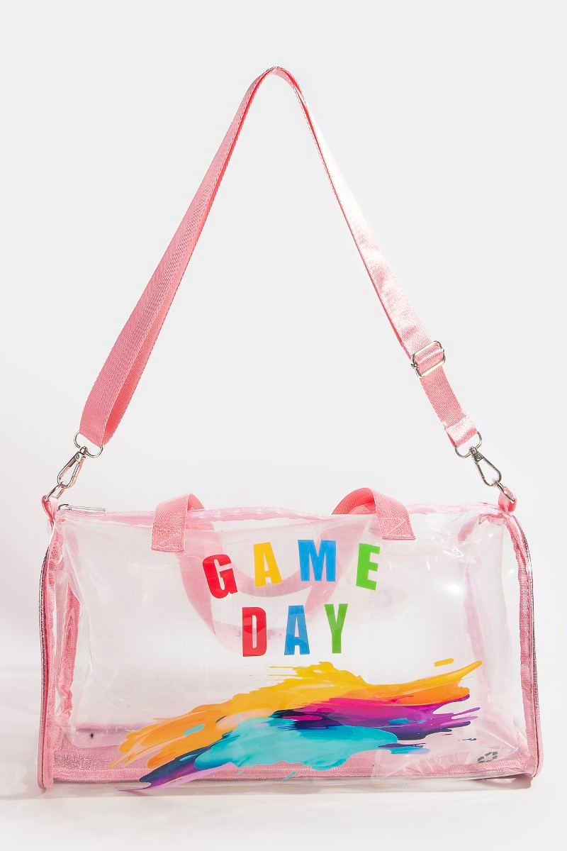 - This hand bag introduces a stunning game day print pink accent clear vinyl style. Experience a burst of creativity in accessorizing as this piece effortlessly sets the tone for your unique style.