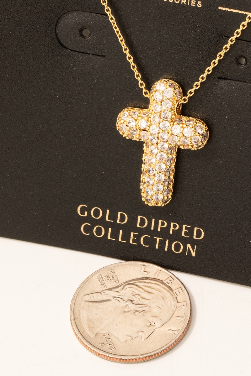 • This necklace brings a stunning gold dipped cubic zirconia pave bubble cross pendant style. Unveil modern elegance with this subtly intricate necklace.