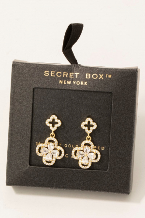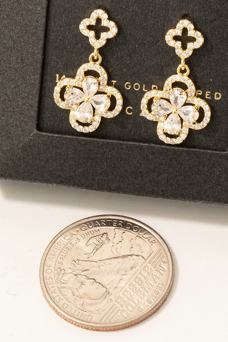 - This pair of drop earrings features a fashionable gold dipped cubic zirconia pave double clover style. Discover the perfect balance of functionality and fashion.