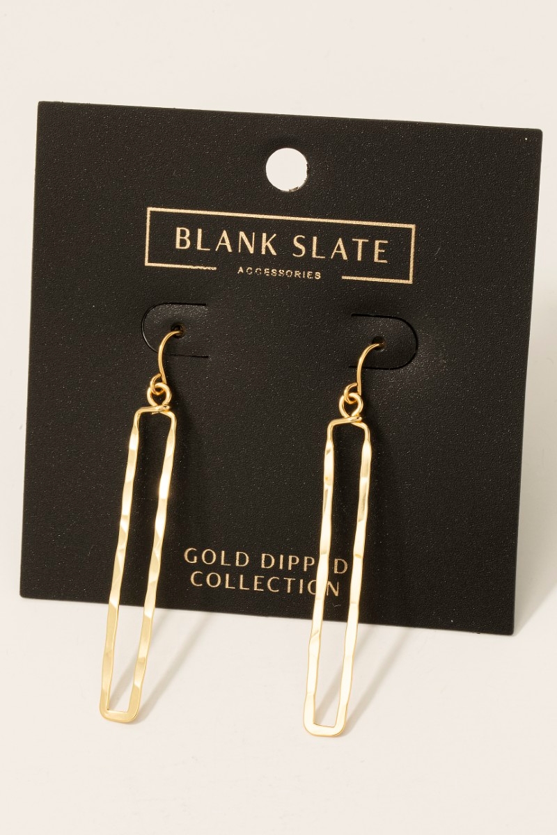 • This pair of dangle earrings brings a luxurious gold dipped hammered narrow rectangle style. Celebrate individuality with this pair of dangle earrings that effortlessly expresses your unique sense of style.