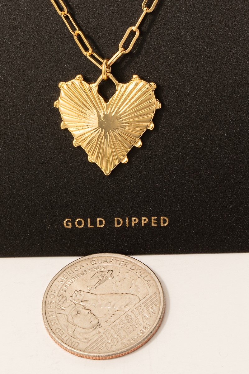 - This necklace brings a luxurious gold dipped shining heart pendant style. Immerse yourself in the world of understated glamour as this necklace effortlessly exudes timeless appeal.