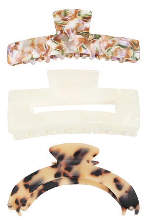 - This displays a vibrant 3 piece mixed acetate hair claws style. Experience refined sophistication with this understated yet stylish piece.
