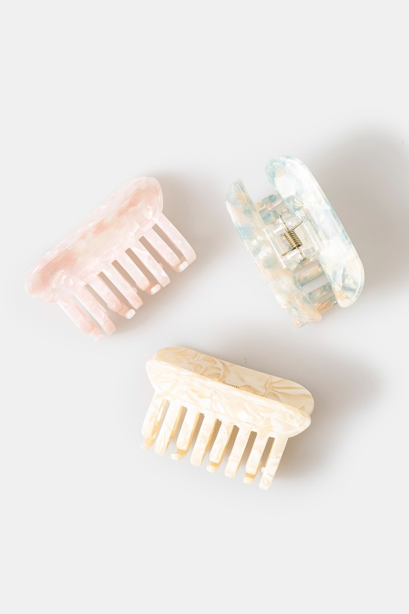 • This hair claw displays a fashionable three piece acetate set style. Explore a blend of classic charm and contemporary flair.