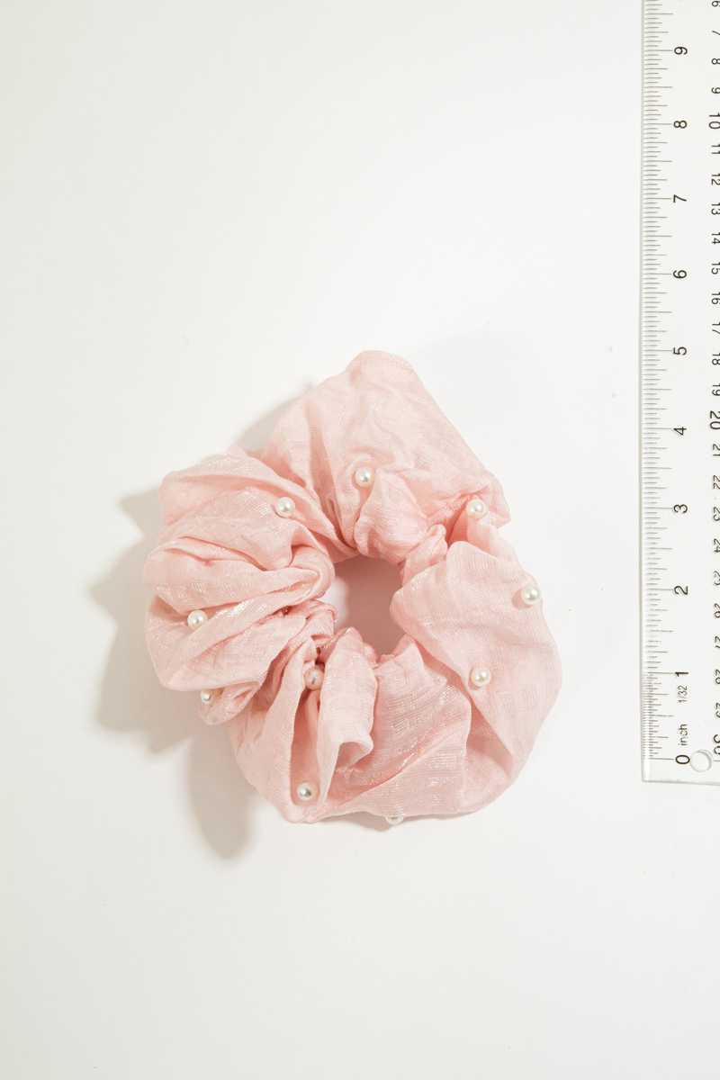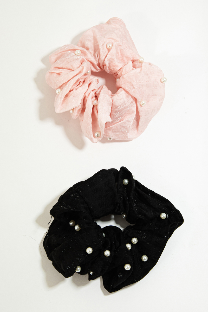 - This headband introduces a unique pearl beaded two piece scrunchie set style. Experience a subtle blend of modernity and classic charm as this headband effortlessly adorns your ensemble.