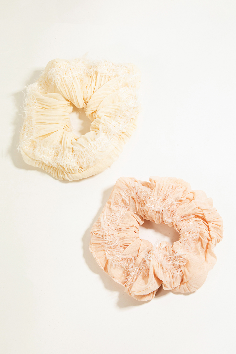 - This headband introduces a unique two piece fuzzy hair scrunchie set style. Explore a refined sense of style with this headband, seamlessly elevating the chic factor of your look.