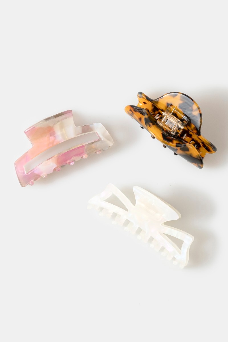 • This hair claw showcases a unique acetate three piece assorted set style. Savor the craftsmanship that goes beyond the ordinary, as this hair claw effortlessly captivates attention.