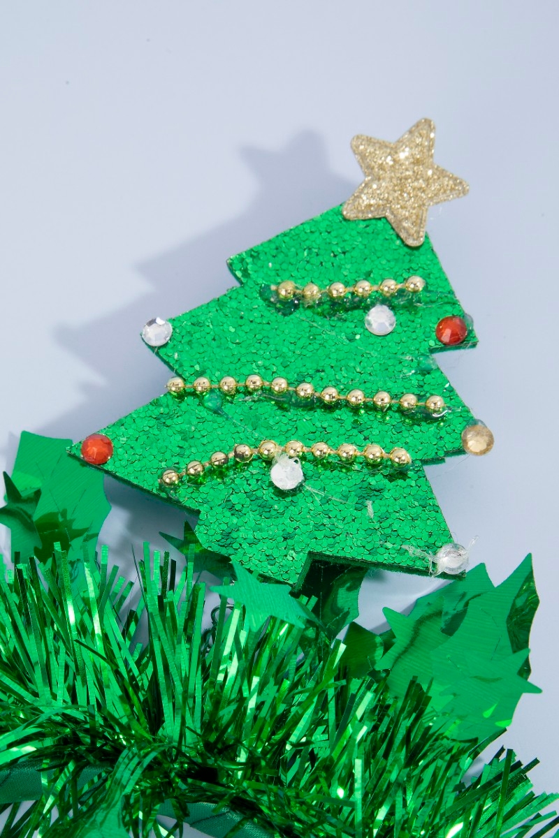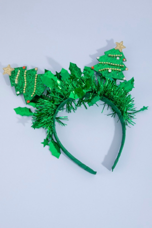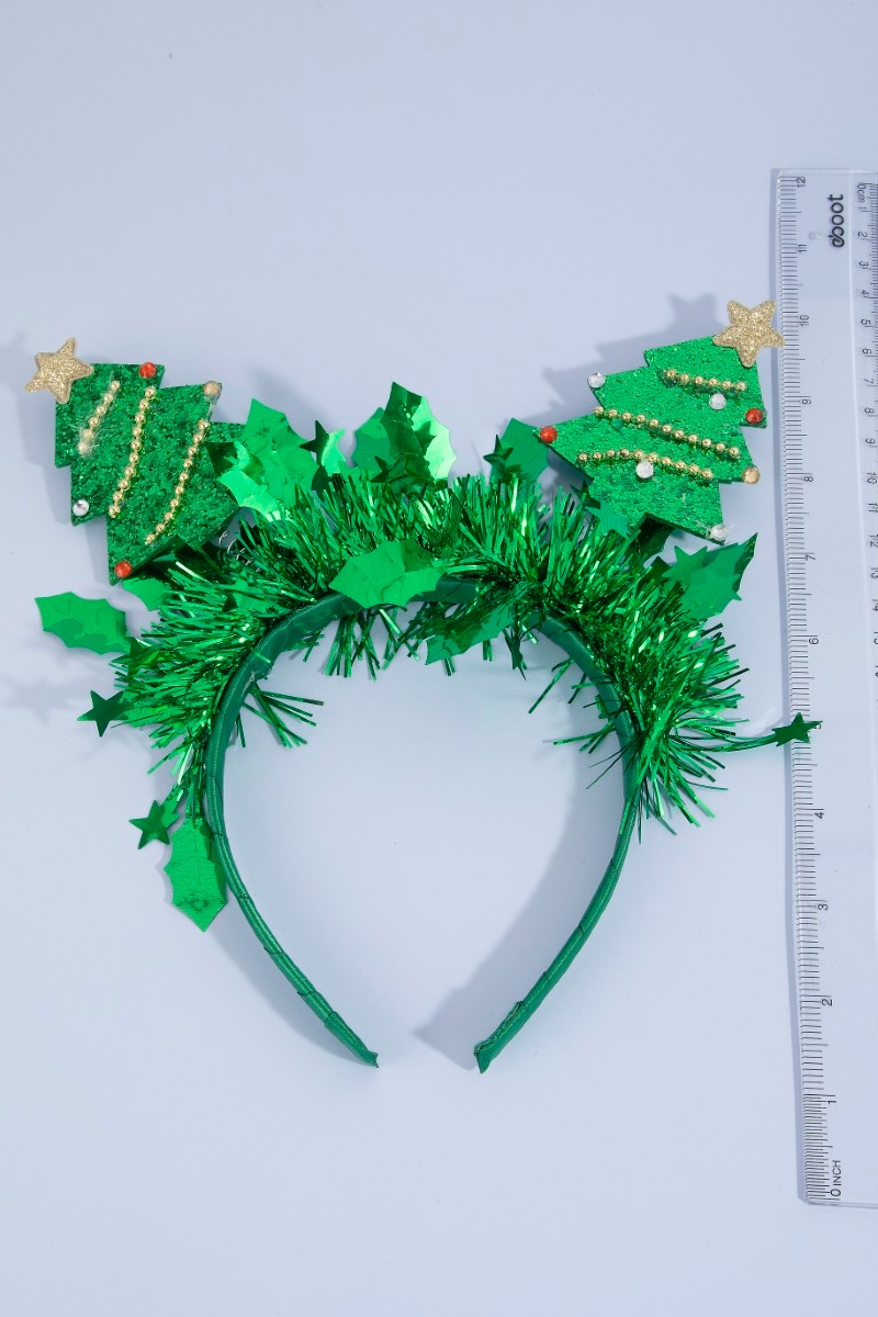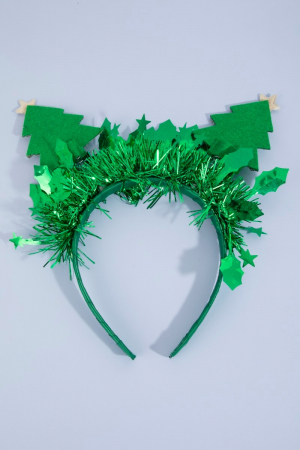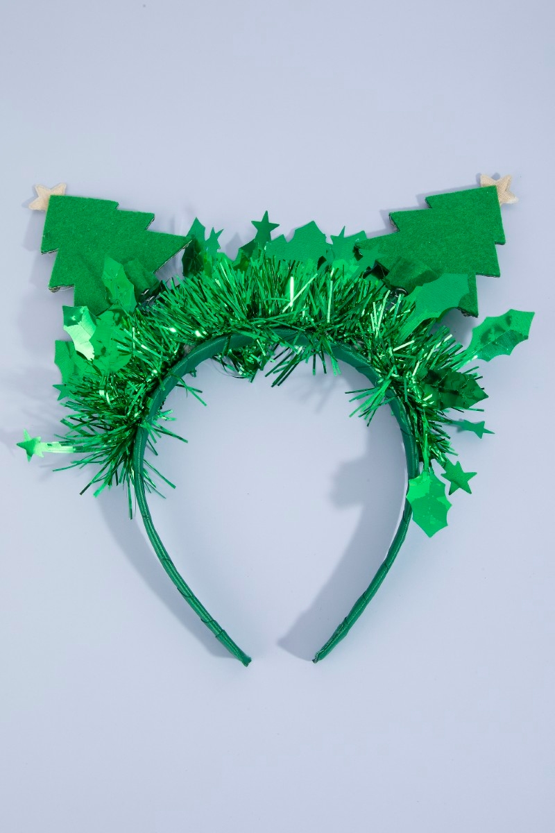 - This headband displays a fashionable tinsel and christmas tree festive style. Experience a burst of creativity in accessorizing as this piece effortlessly sets the tone for your unique style.