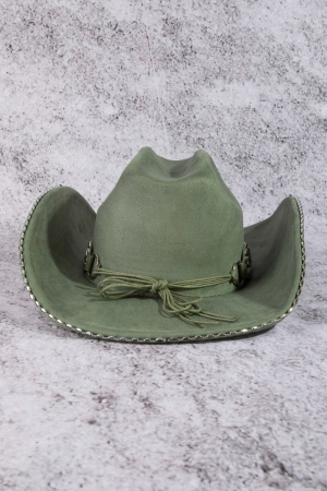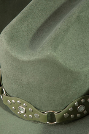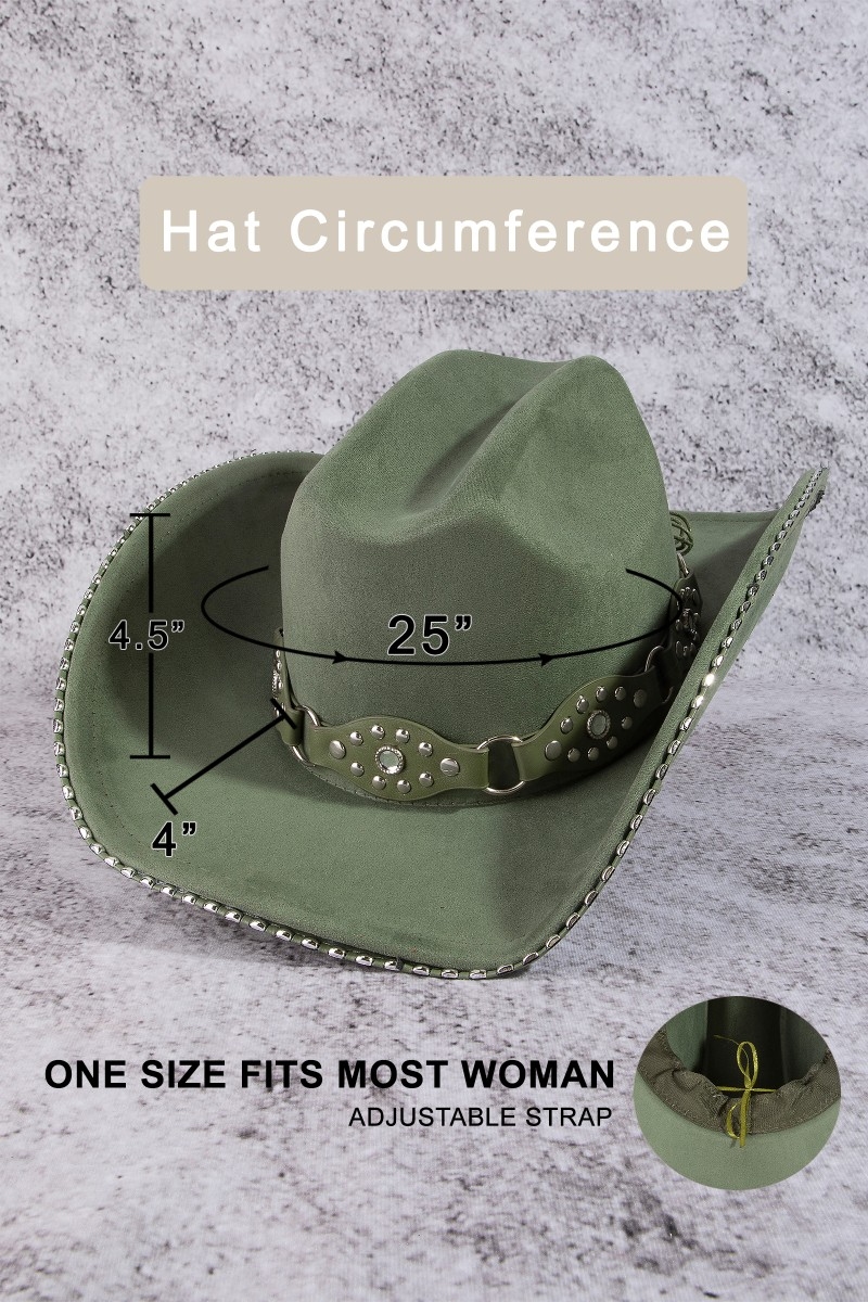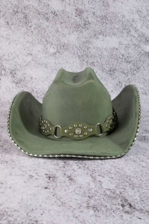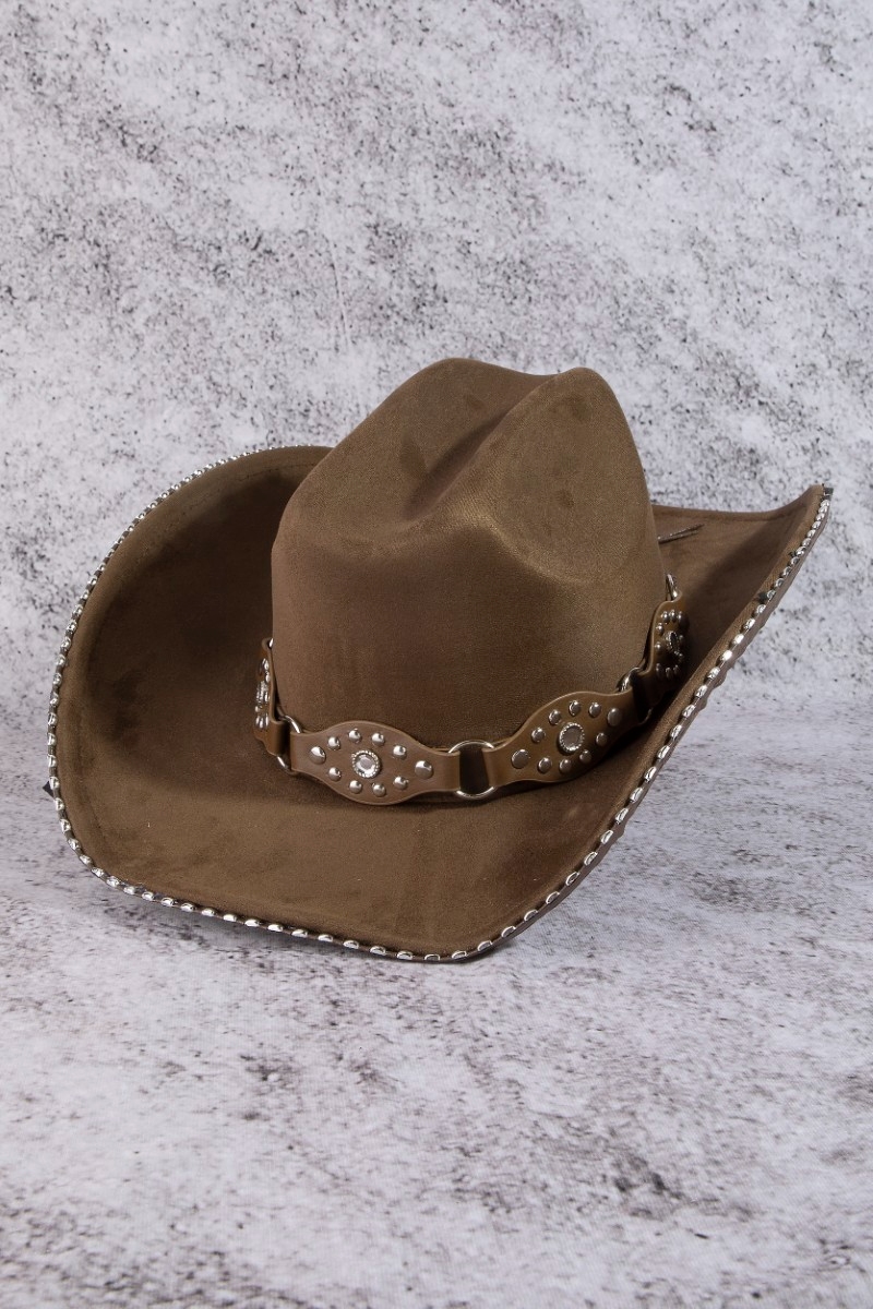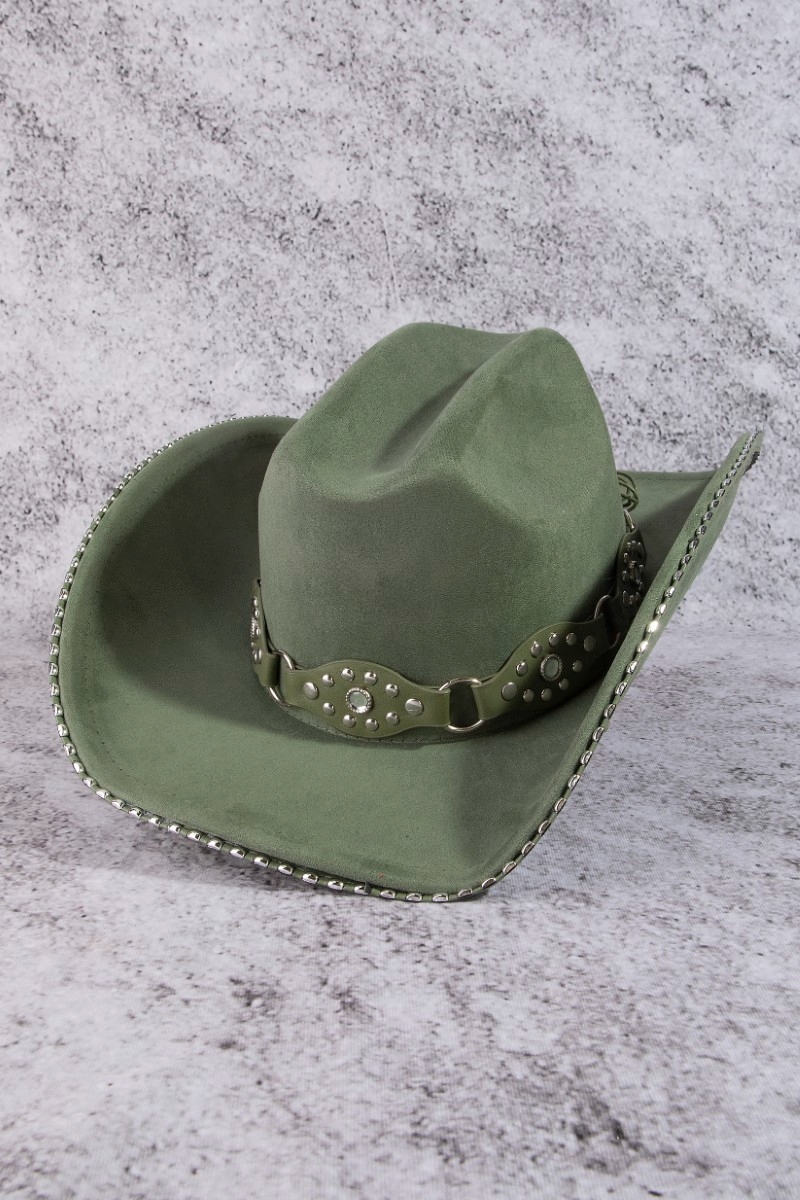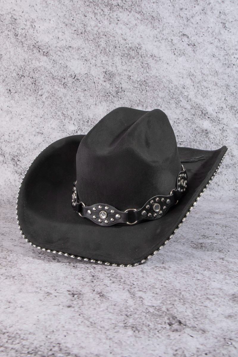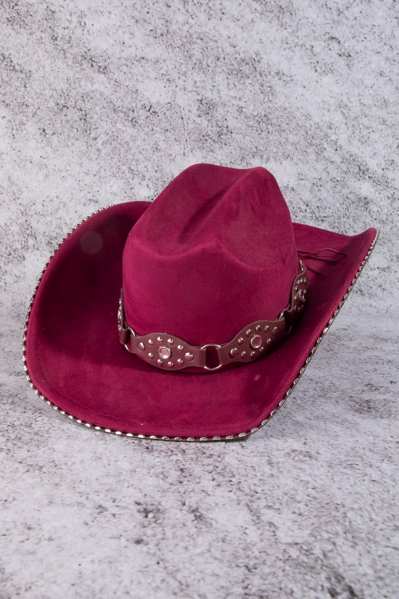 - This cowboy hat adds a modern vegan leather studded western style. Experience a subtle blend of modernity and classic charm as this cowboy hat effortlessly adorns your ensemble.