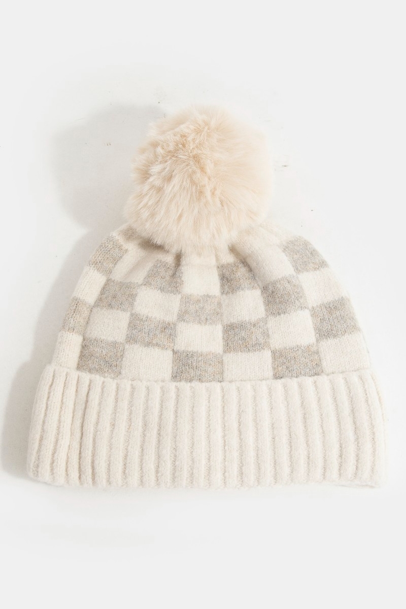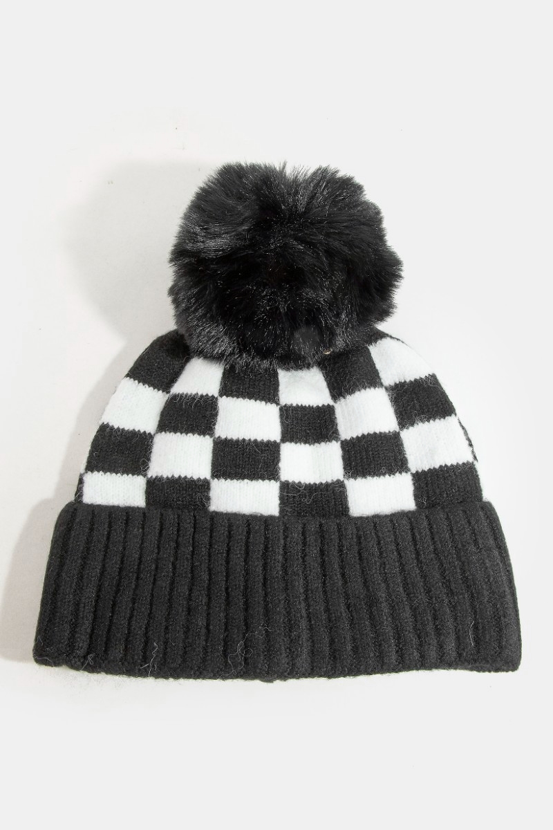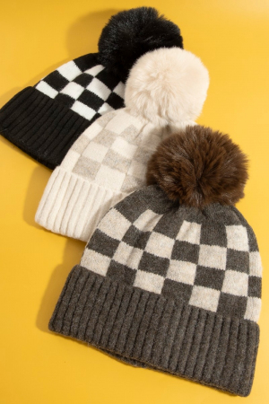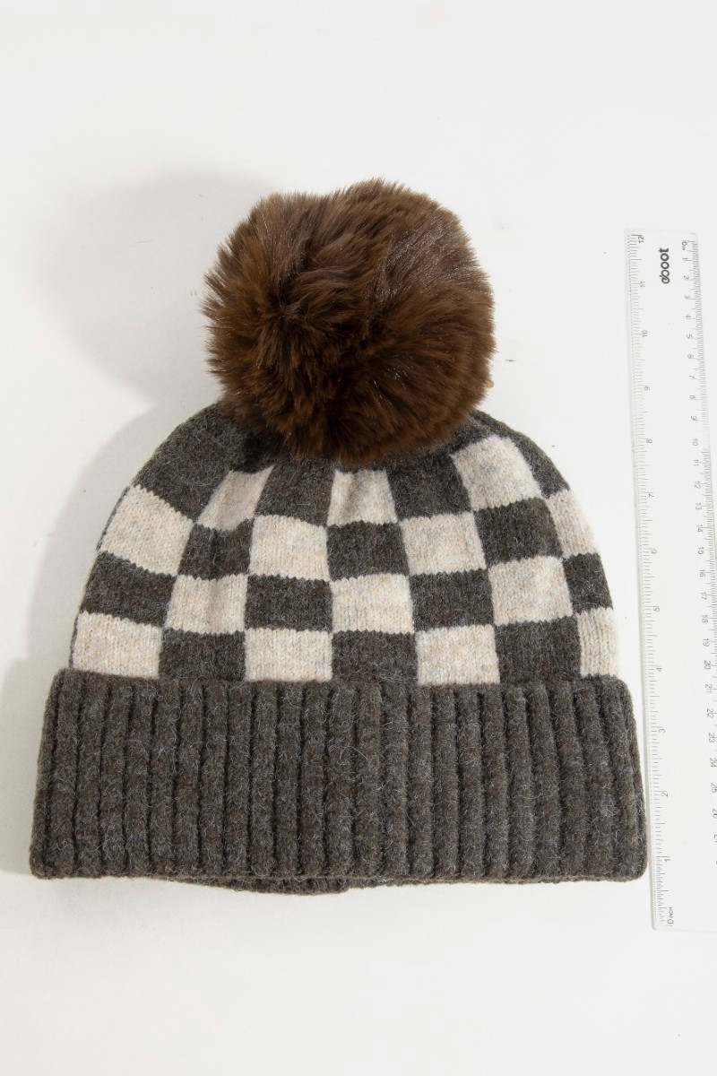 - This beanie introduces a stunning checkered pom style. Indulge in the artistry of accessorizing with this unique piece.