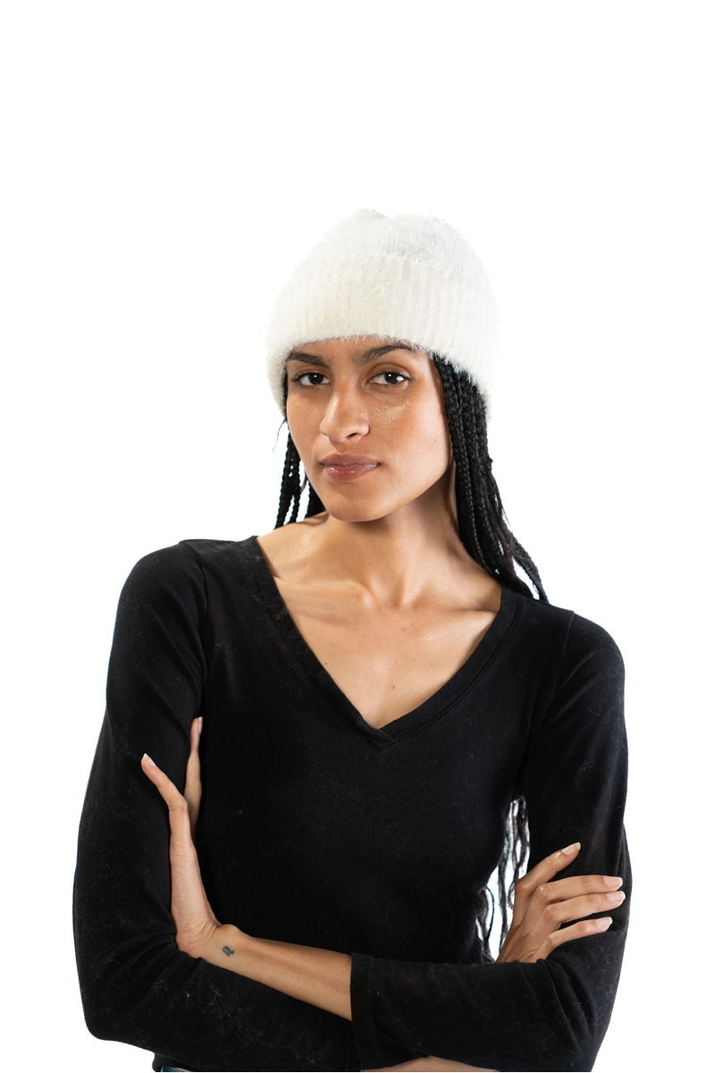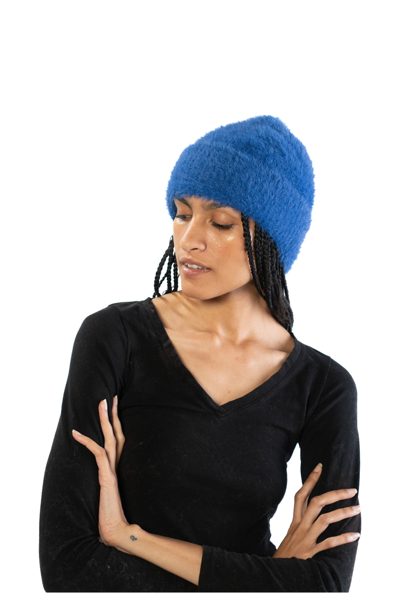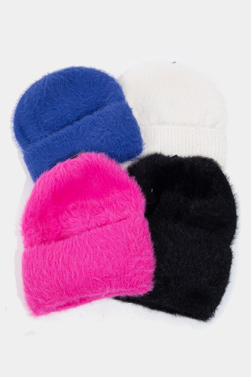 - This beanie brings a luxurious fuzzy knit fashion style. Savor the craftsmanship that goes beyond the ordinary, as this beanie effortlessly captivates attention.