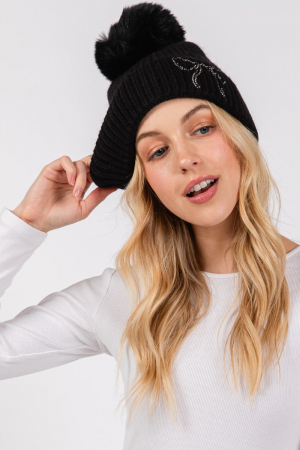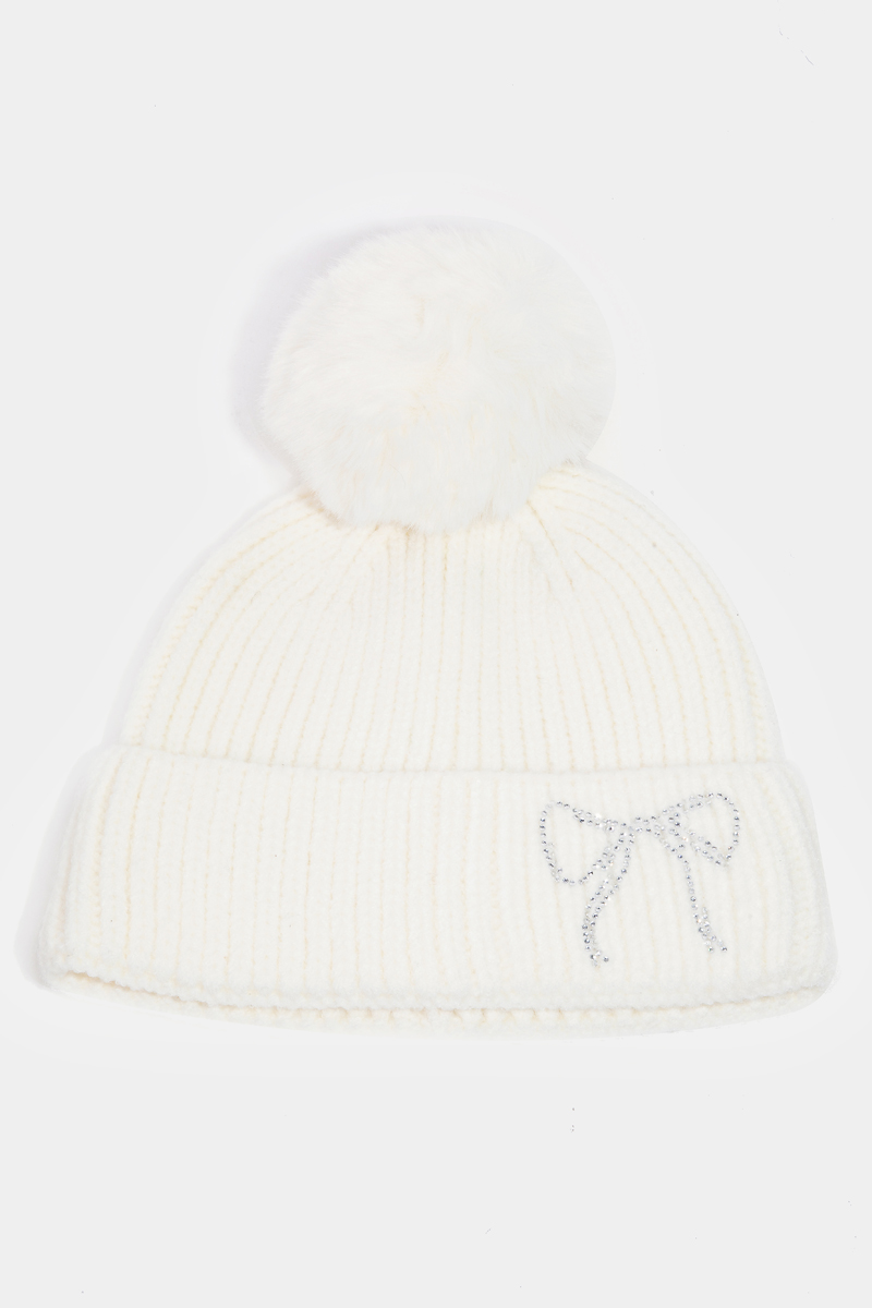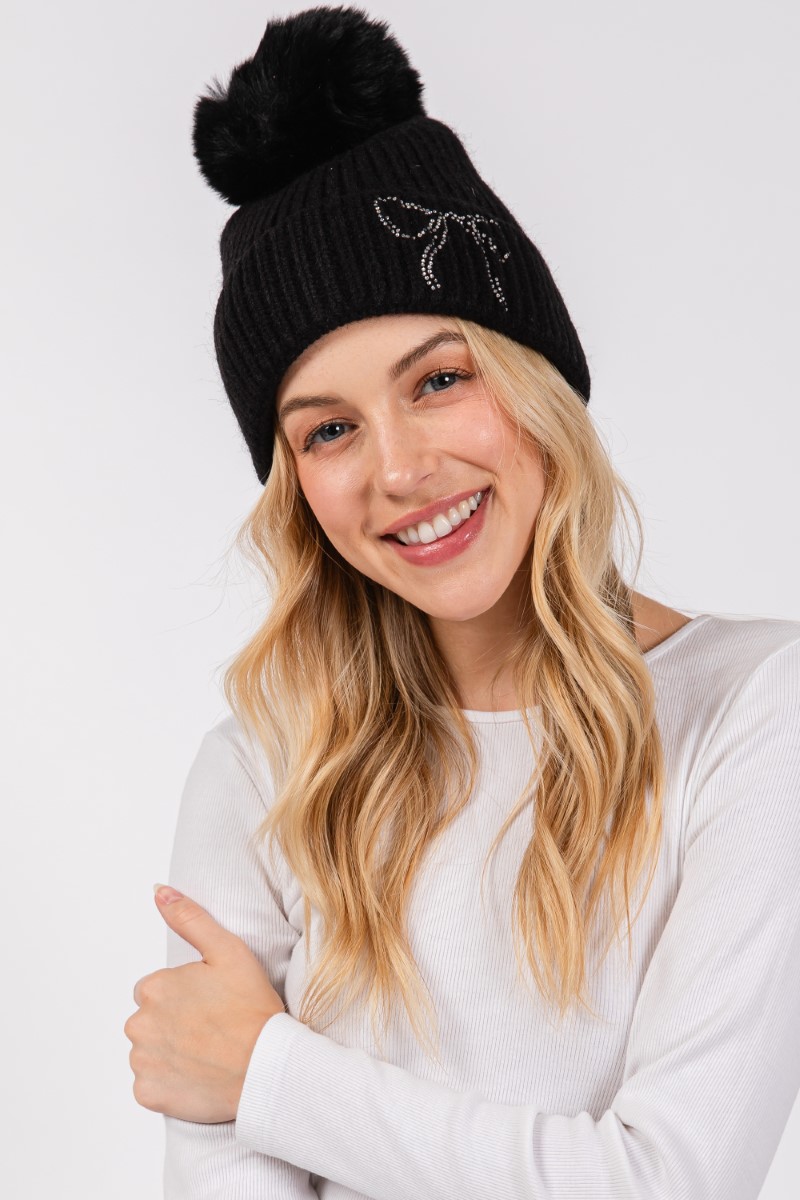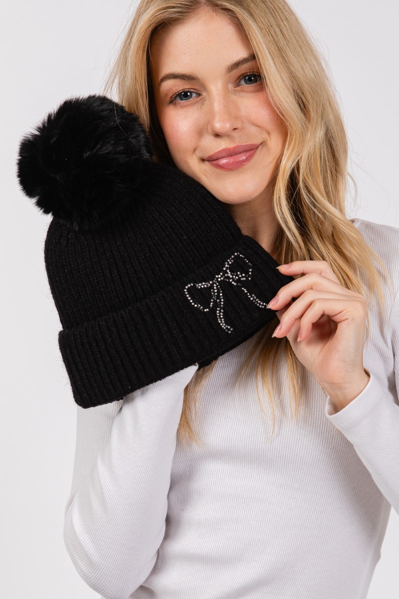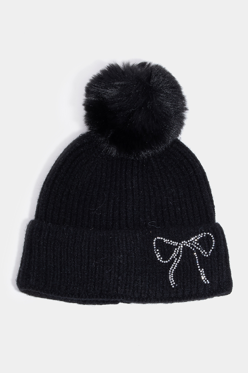 - This beanie displays a vibrant rhinestone embroidered ribbon bow knit style. Unveil a new dimension of sophistication as this beanie effortlessly enhances the elegance of your ensemble.