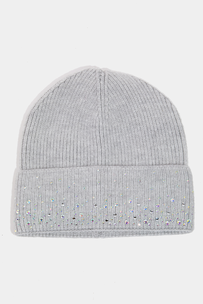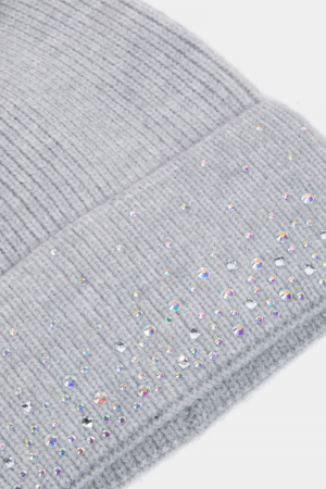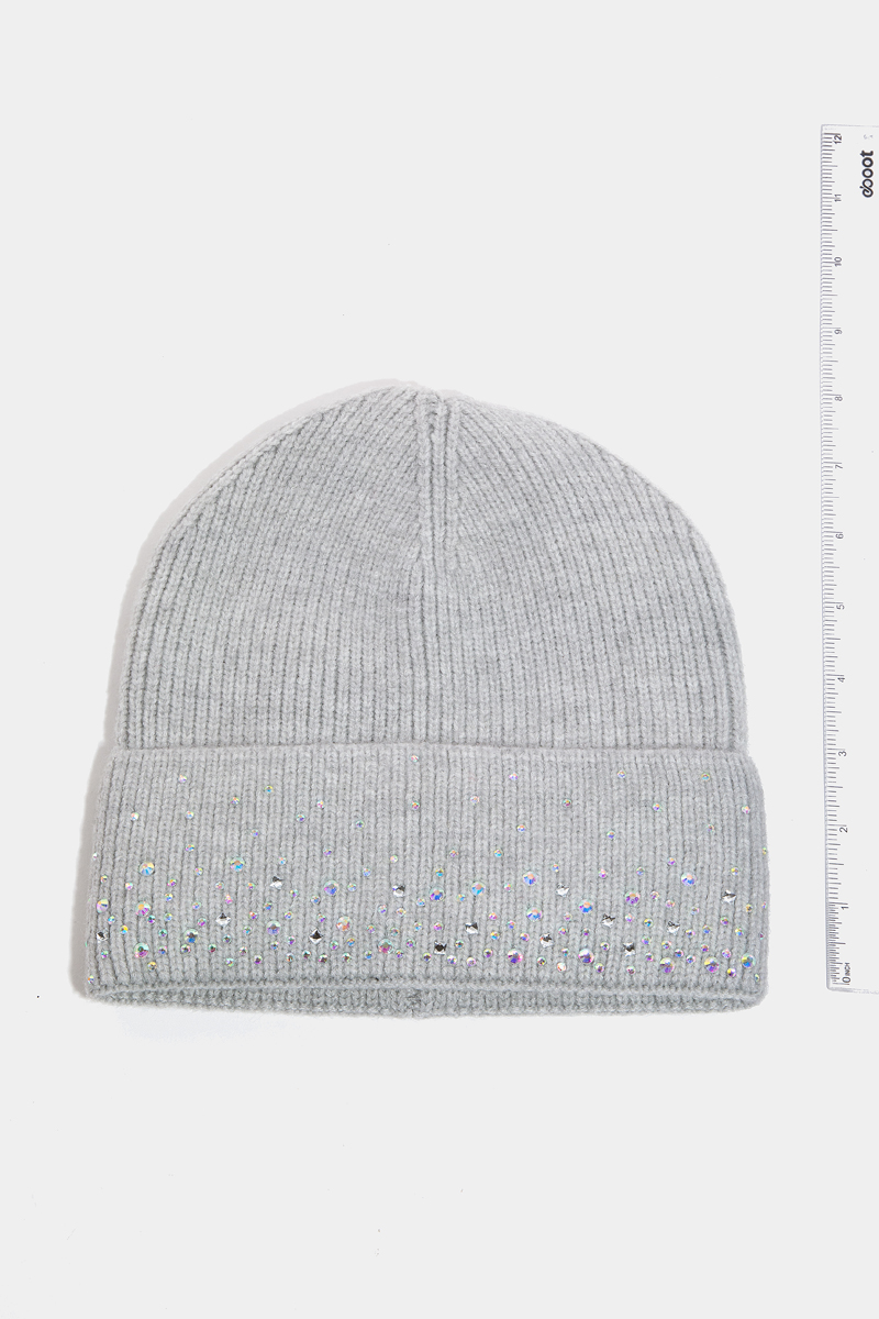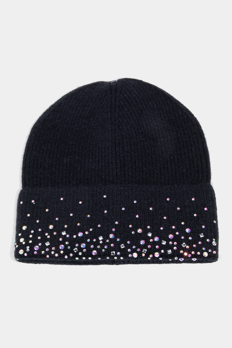 • This beanie adds a modern sparkling rhinestone studded style. Unveil a new dimension of sophistication as this beanie effortlessly enhances the elegance of your ensemble.