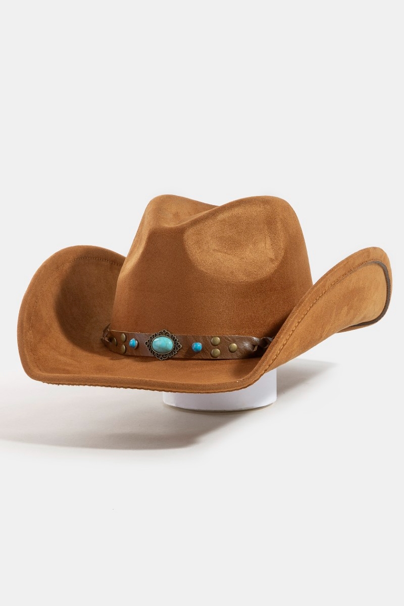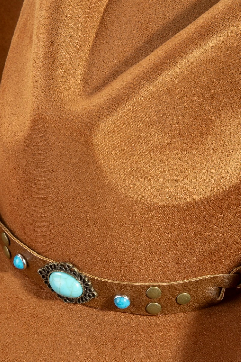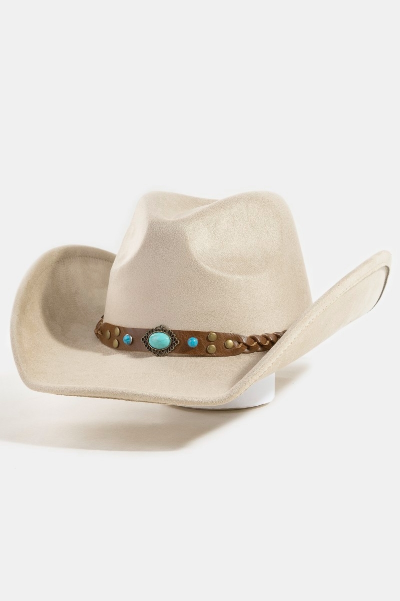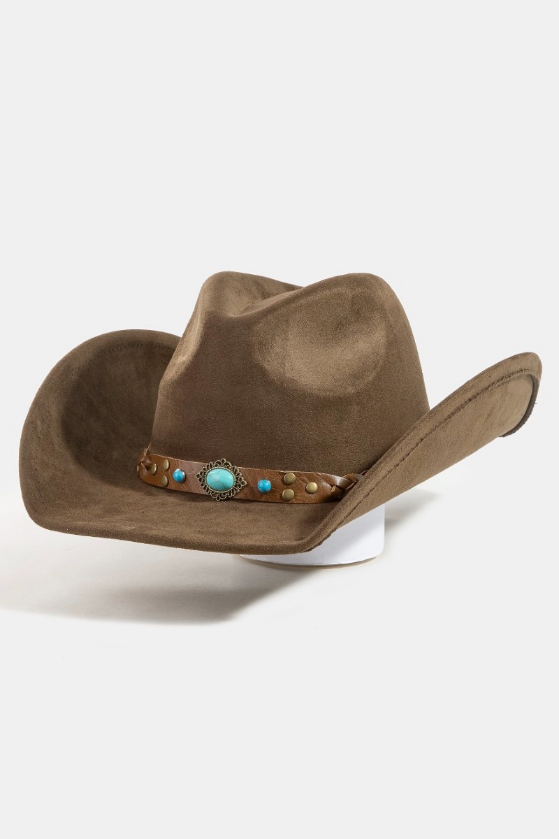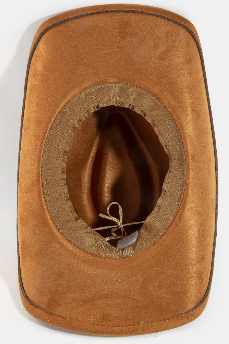 - This cowboy hat brings a unique braided strap faux suede western style. Redefine your look effortlessly with this standout, on-trend piece.