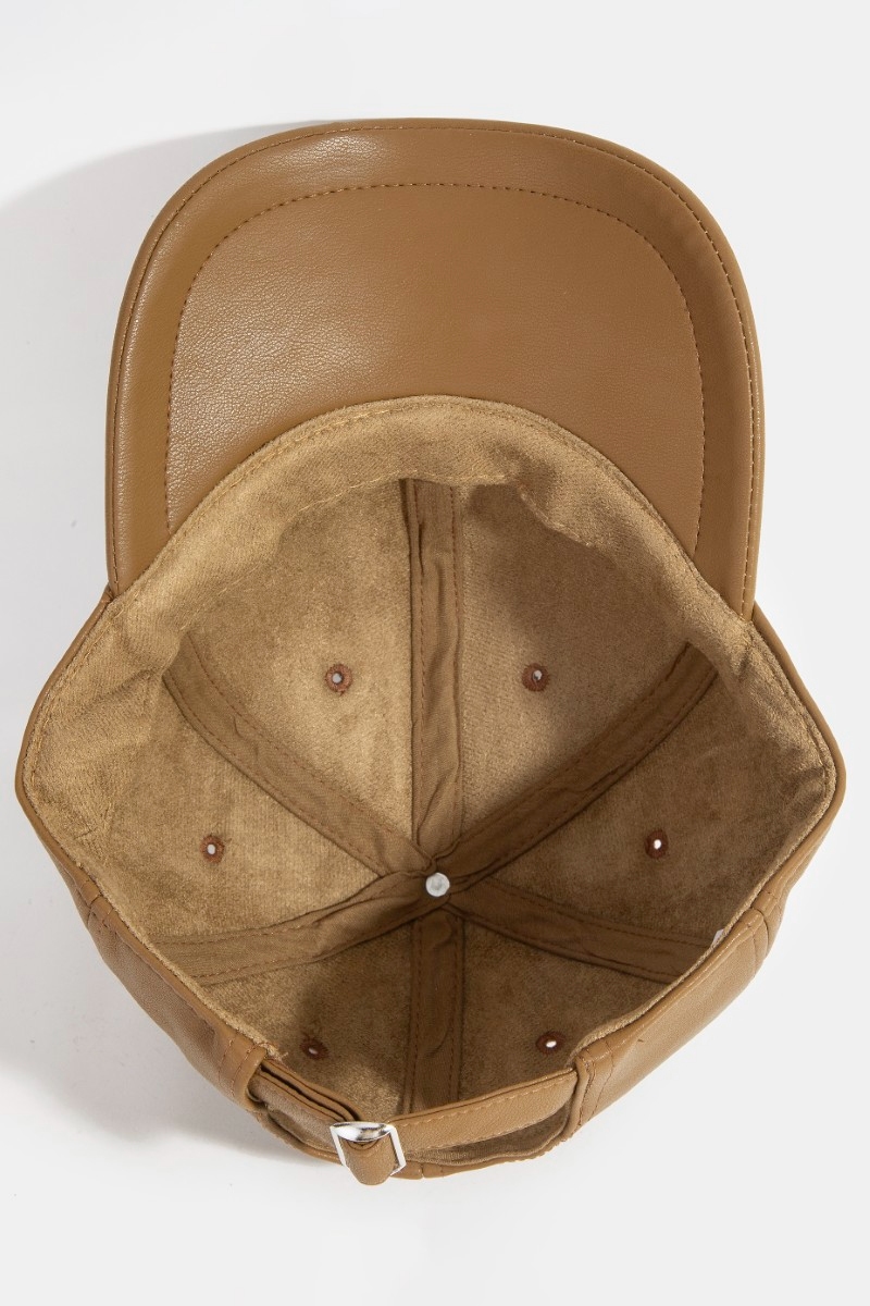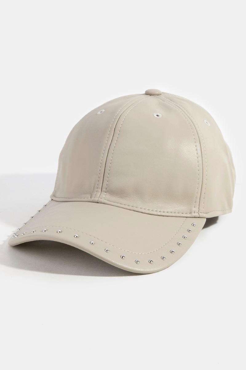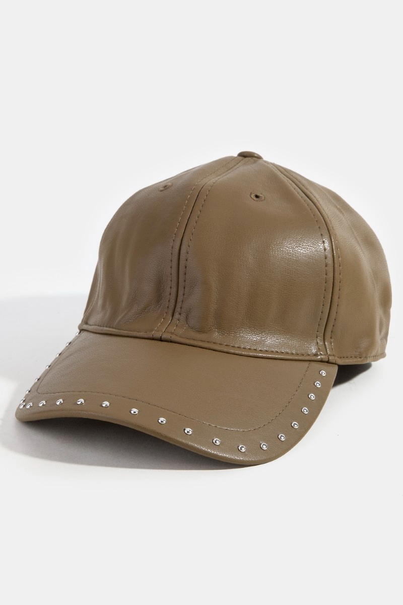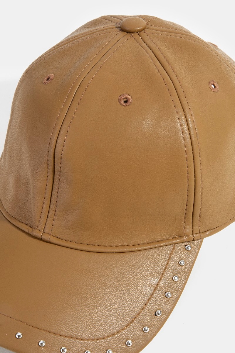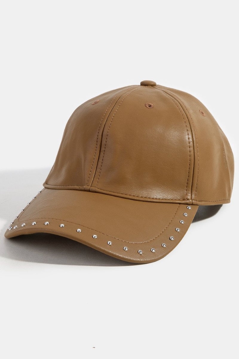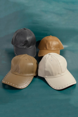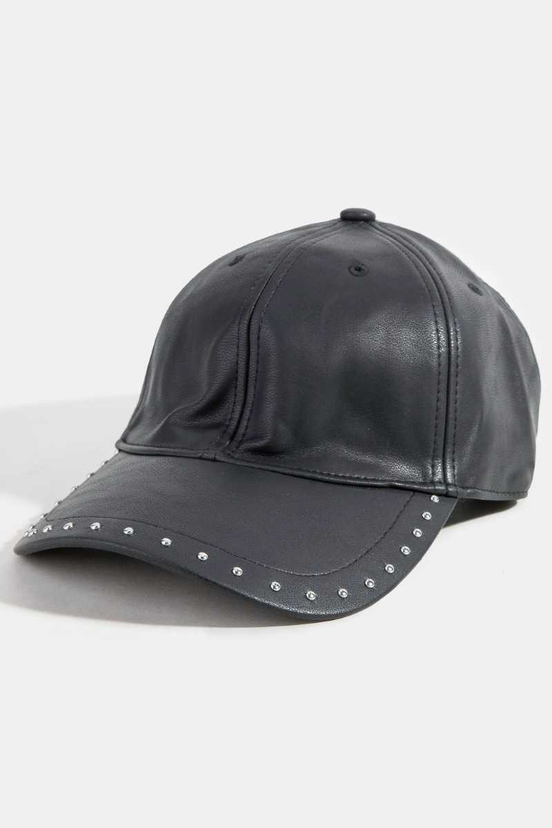 - This cap features a fashionable glossy faux leather rivet trim style. Witness the transformative power of accessories as this piece effortlessly redefines your fashion narrative.