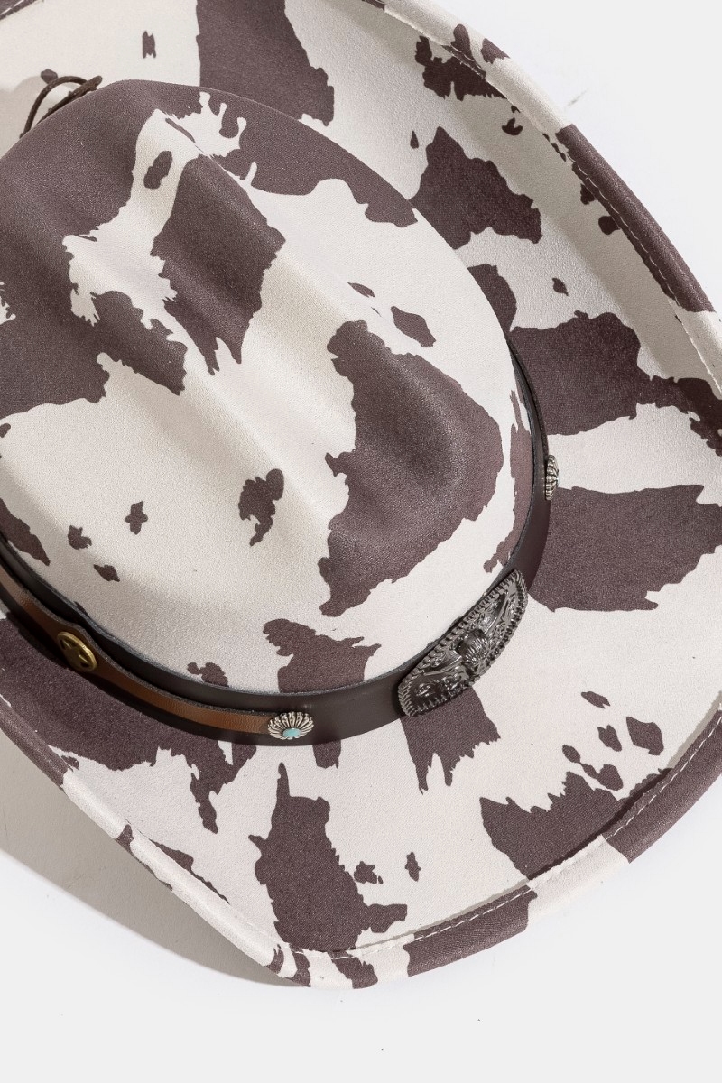 • This cowboy hat displays a vibrant cow print western long horn strap style. Explore a refined sense of style with this cowboy hat, seamlessly elevating the chic factor of your look.