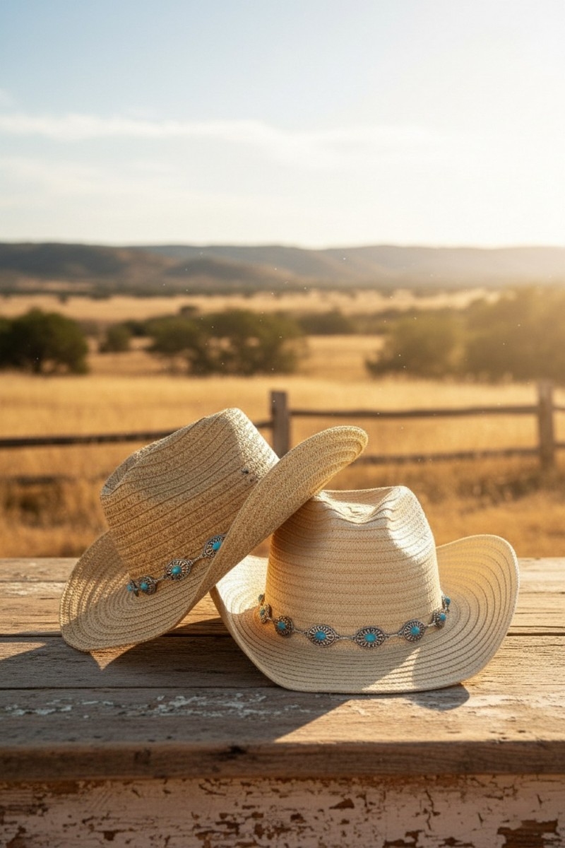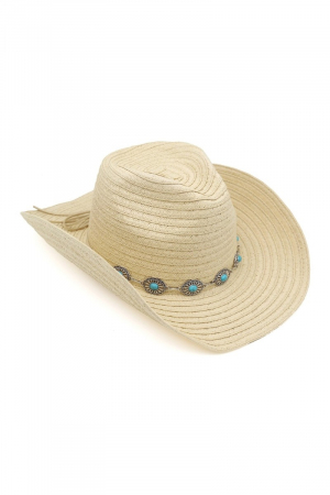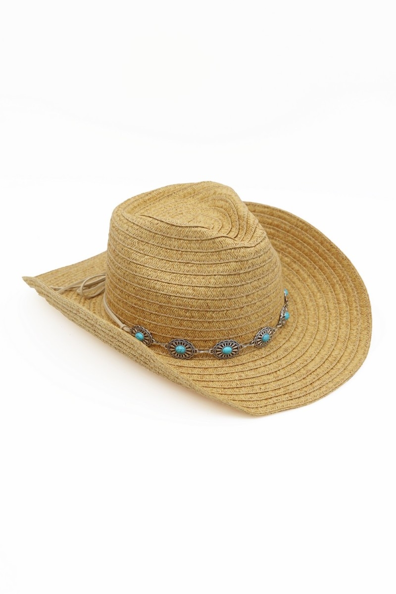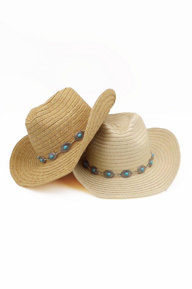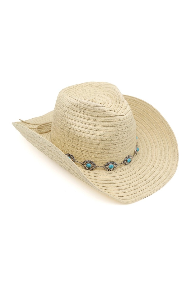 - This cowboy hat brings a luxurious concho chain strap straw western style. Explore a blend of classic charm and contemporary flair.