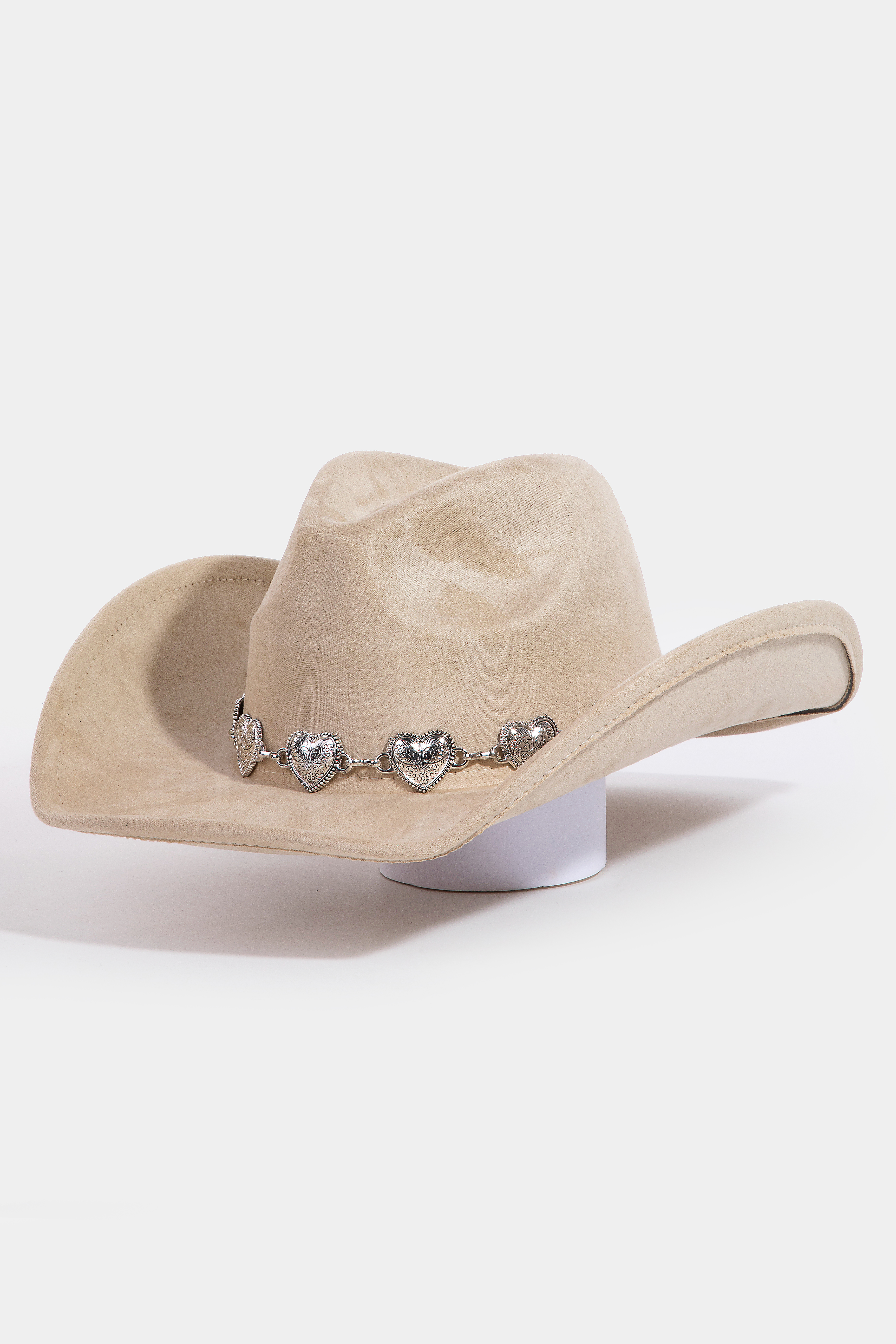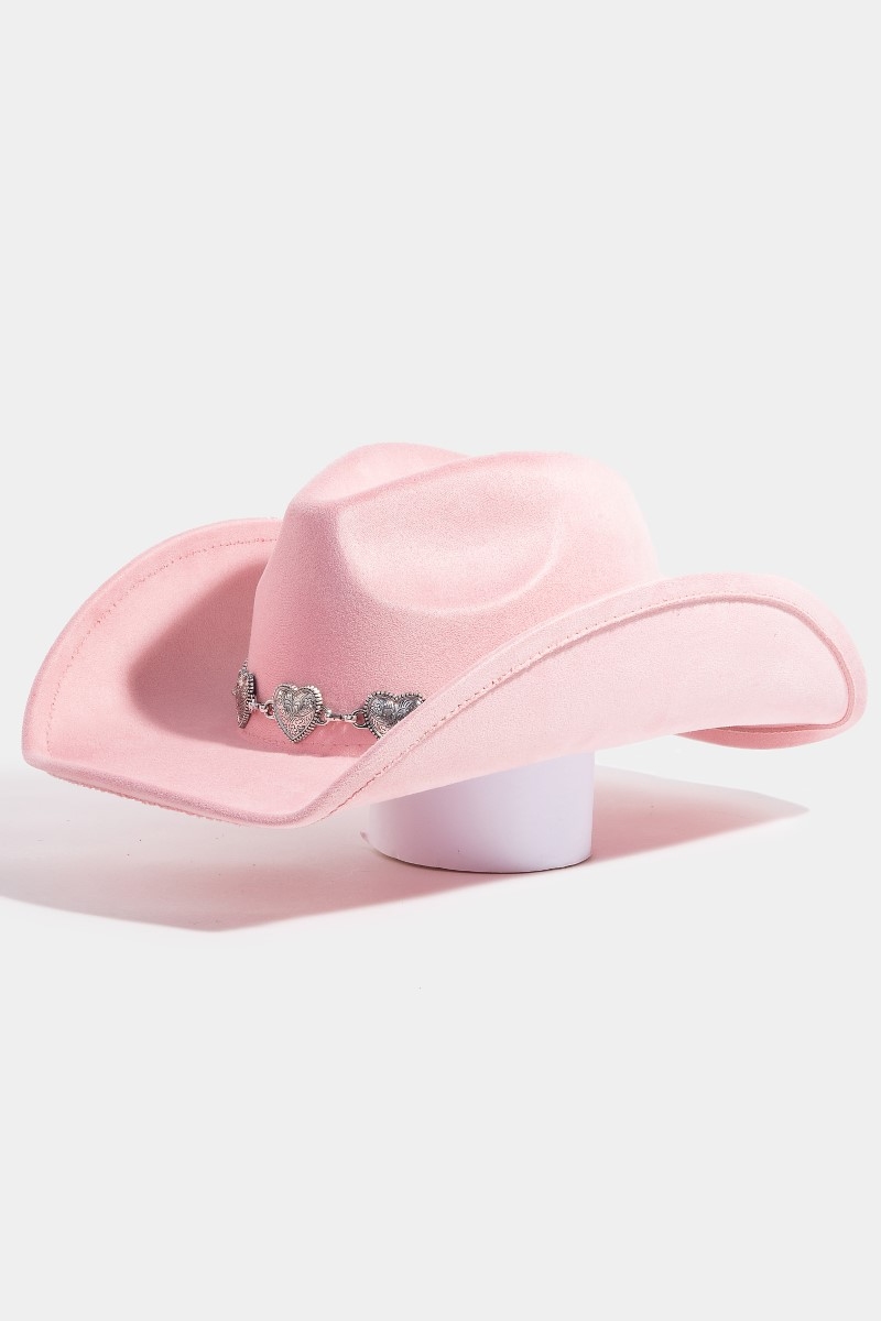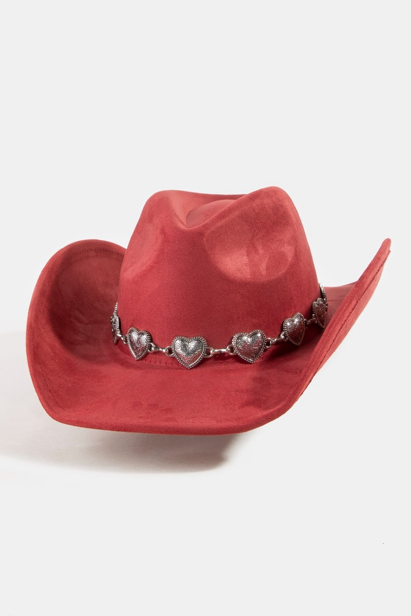 • This cowboy hat features a fashionable engraved heart charms band style. Indulge in the artistry of accessorizing with this unique piece.
