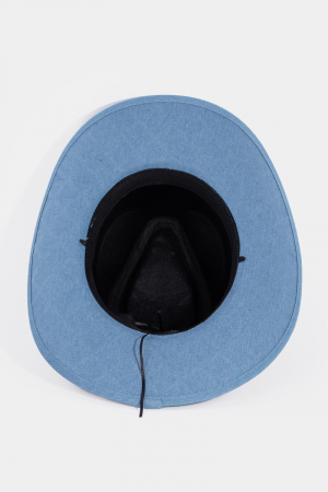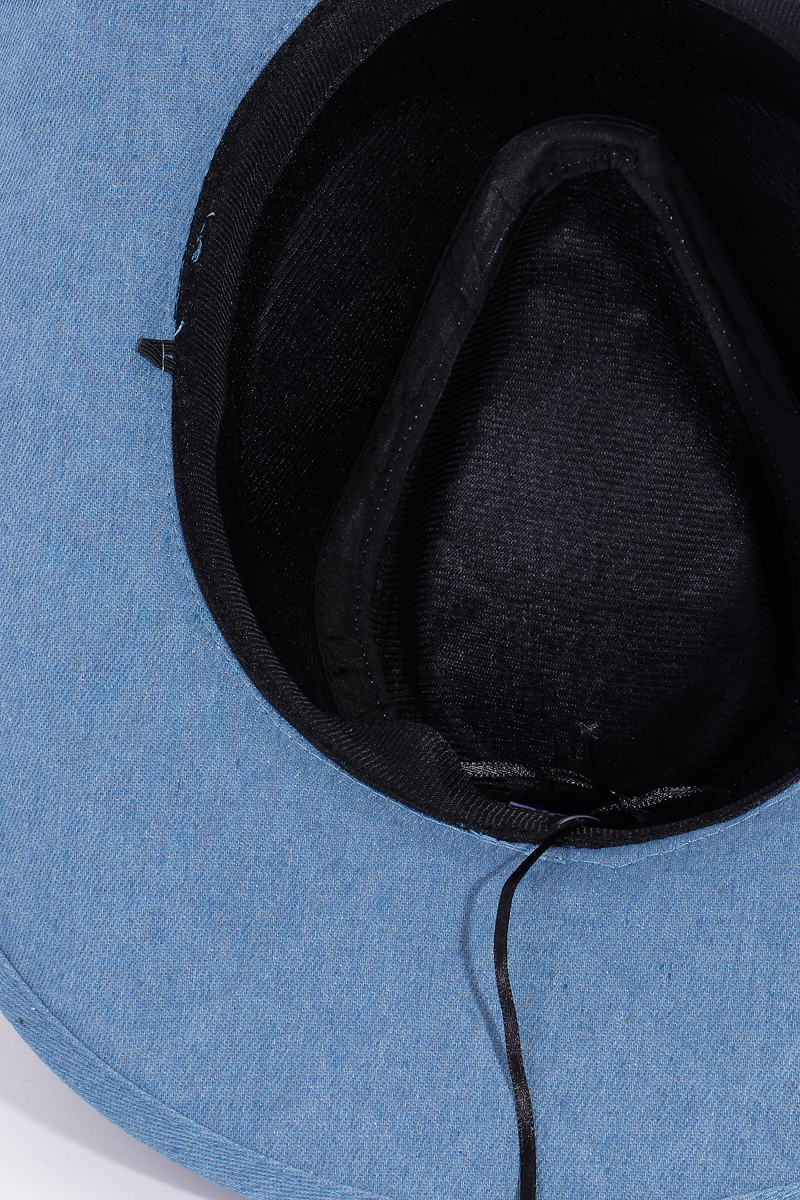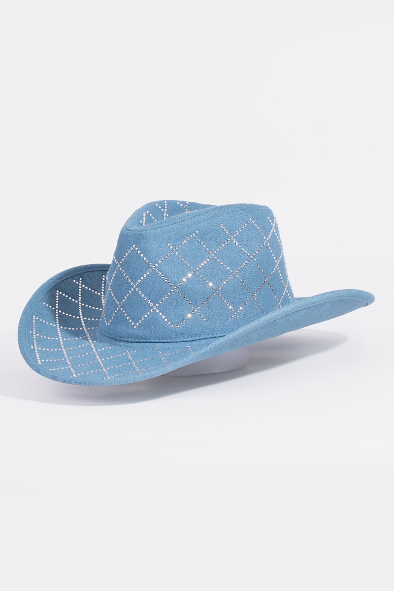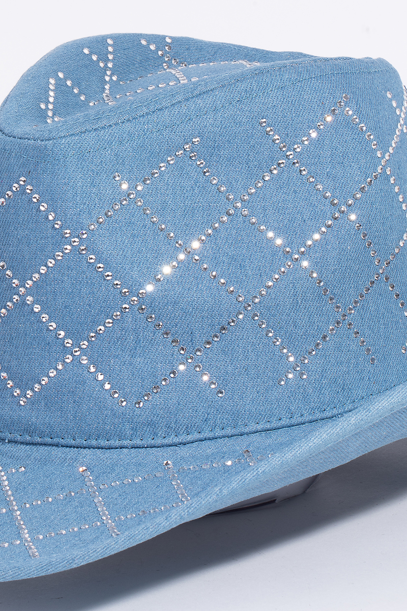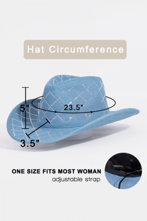 • This fedora hat showcases a unique rhinestone mesh pattern denim cowboy style. Experience a burst of creativity in accessorizing as this piece effortlessly sets the tone for your unique style.
