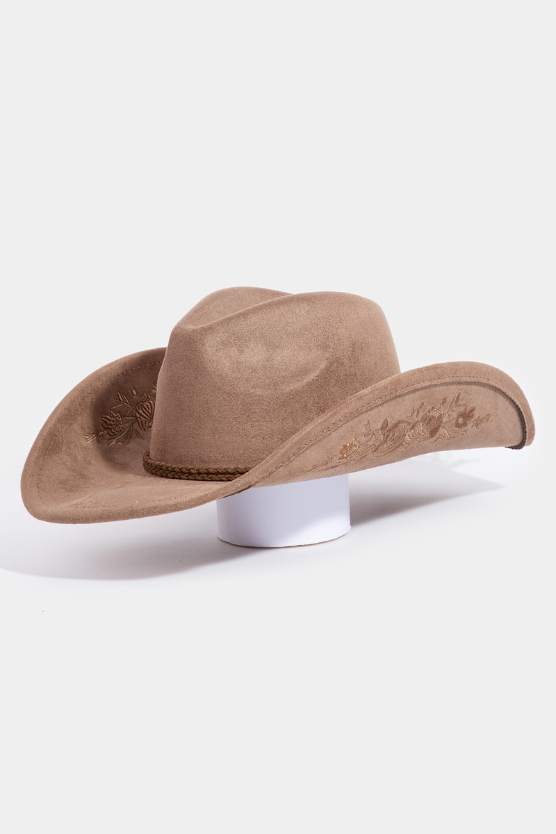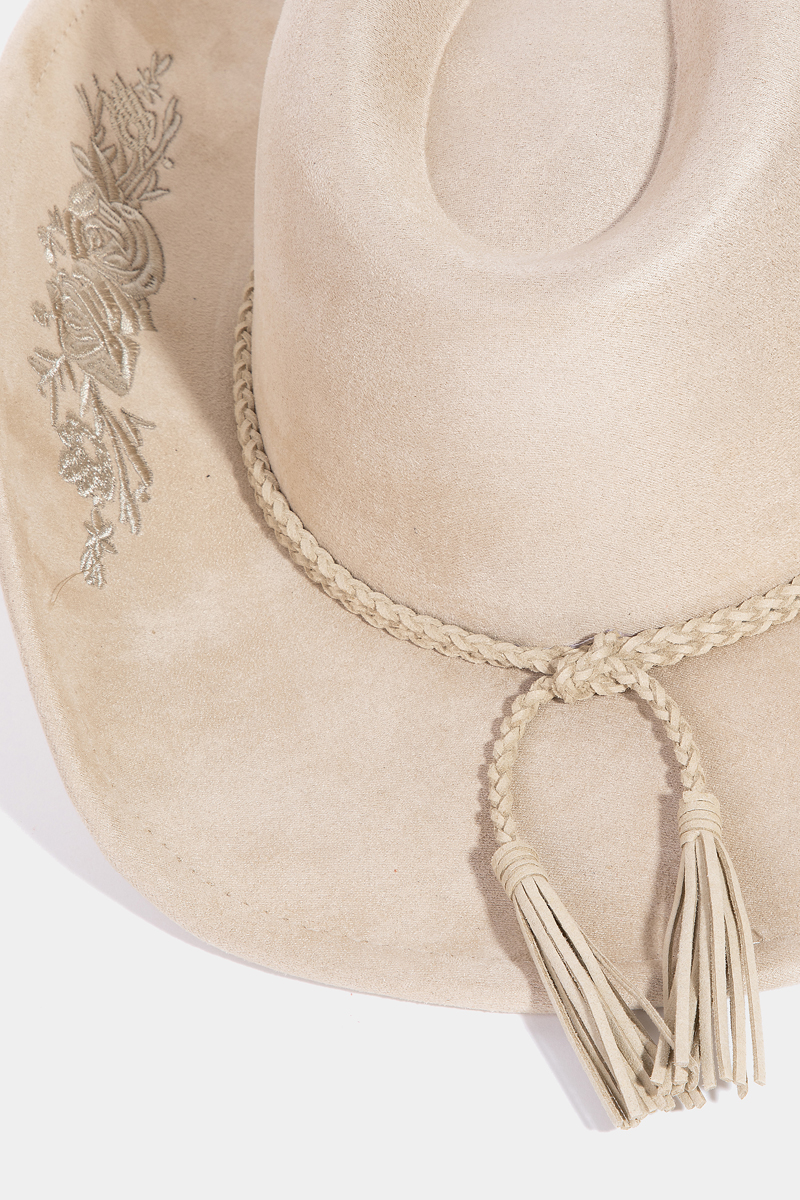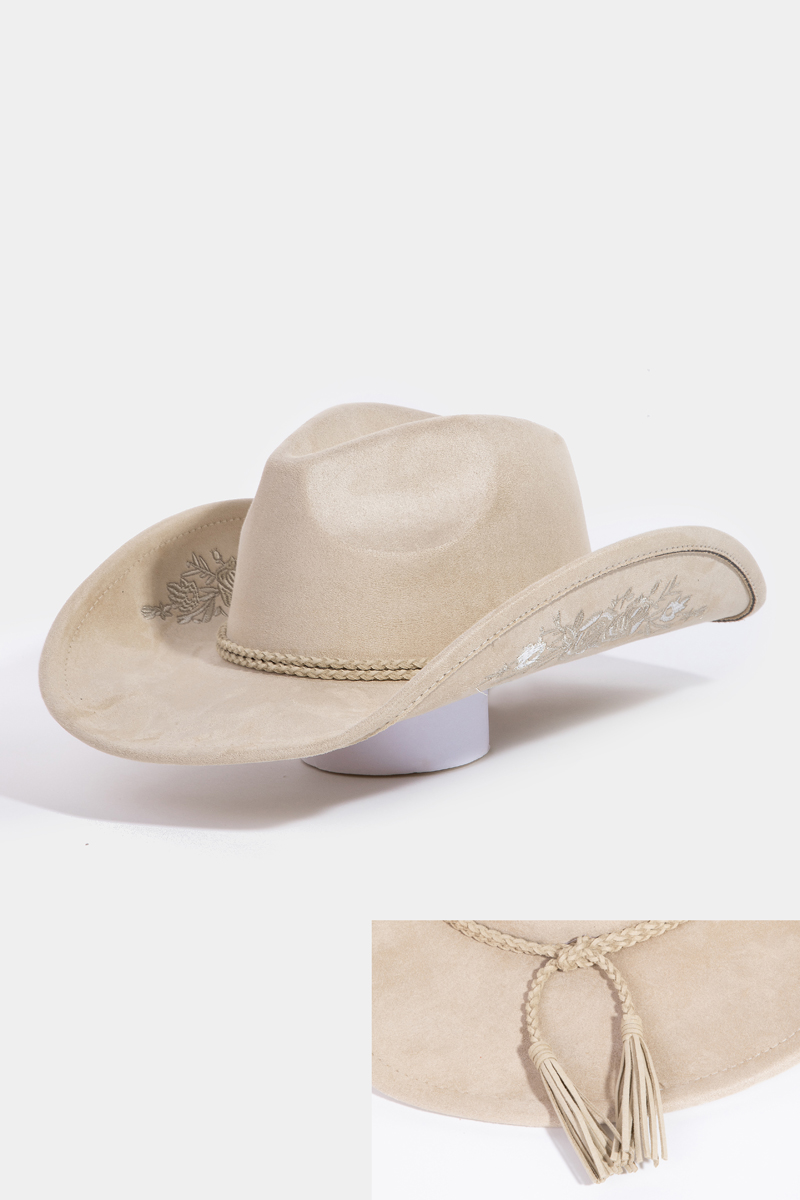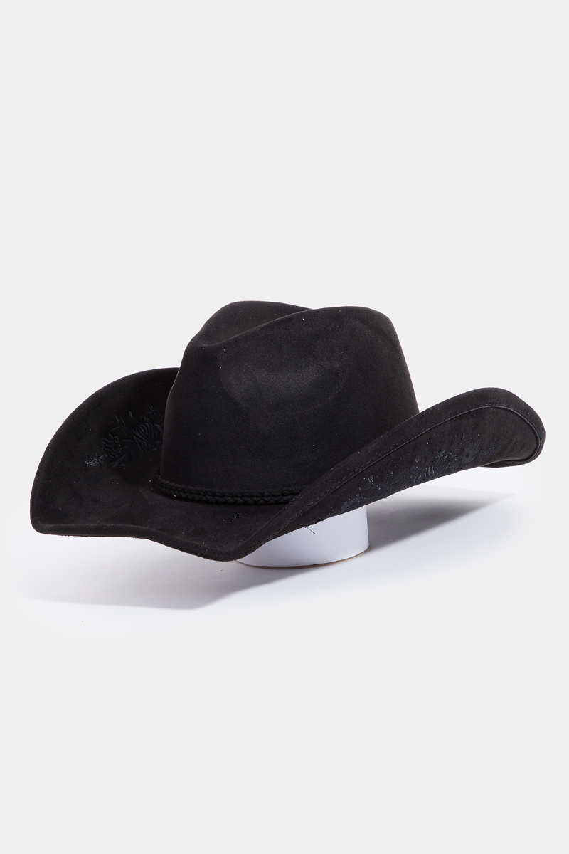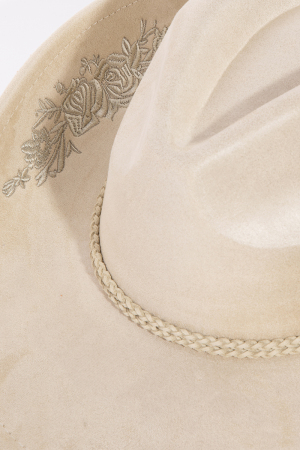 • This cowboy hat showcases a unique rose embroidered braided band fedora style. Experience the joy of accessorizing with this piece that effortlessly combines versatility and charm.
