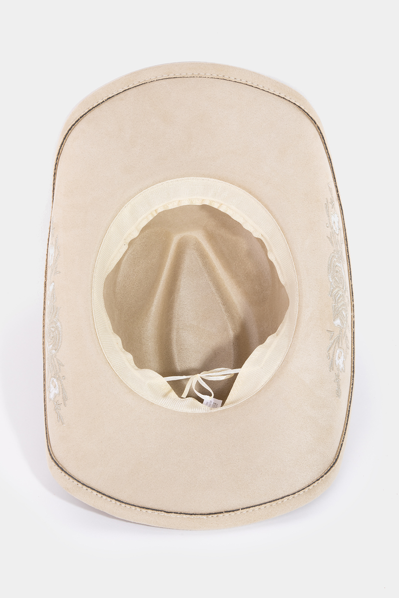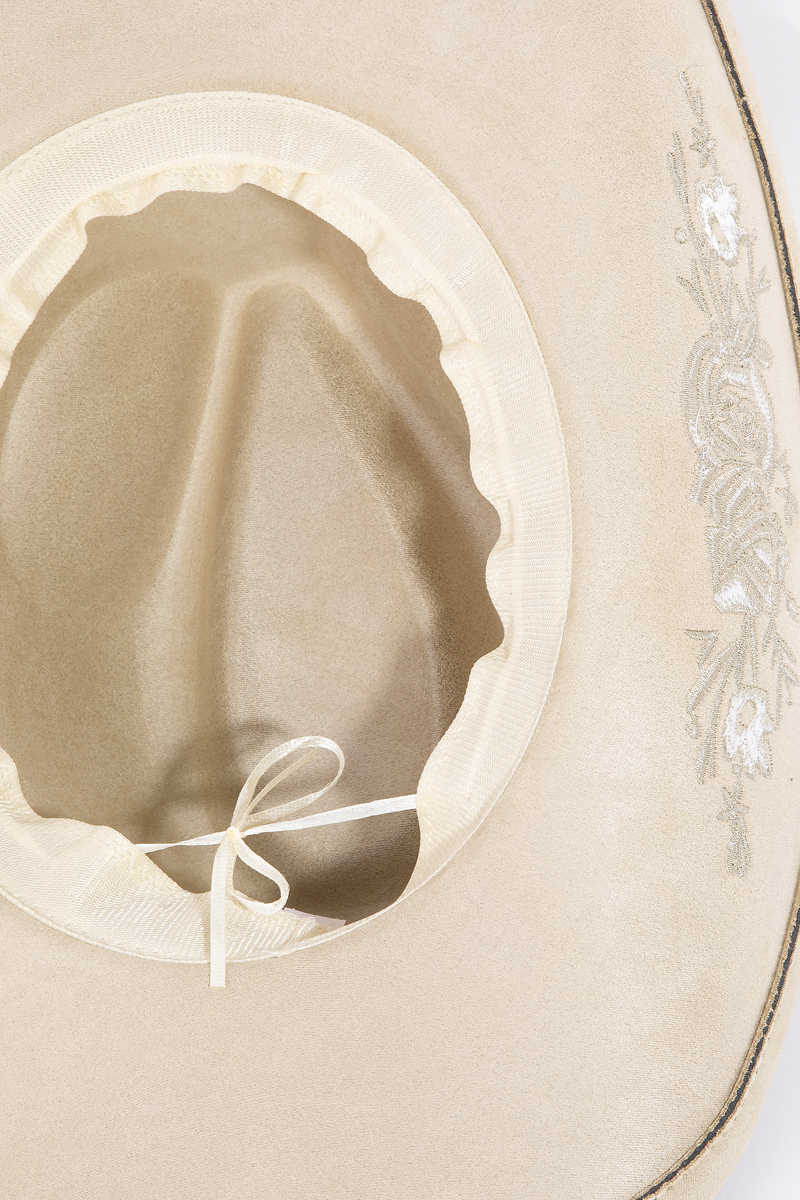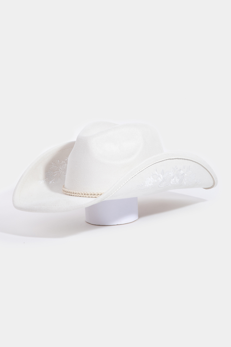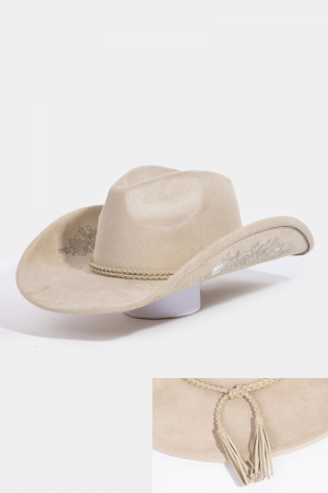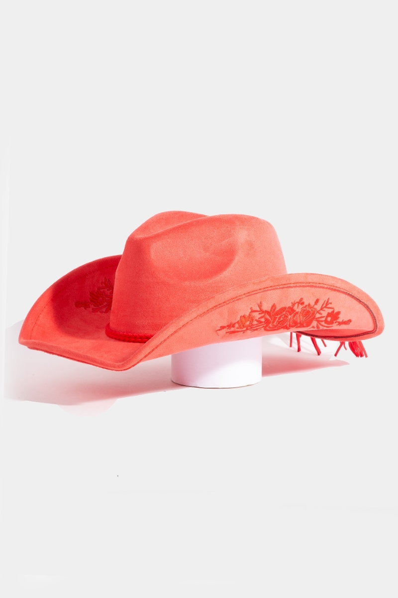 • This cowboy hat showcases a unique rose embroidered braided band fedora style. Experience the joy of accessorizing with this piece that effortlessly combines versatility and charm.