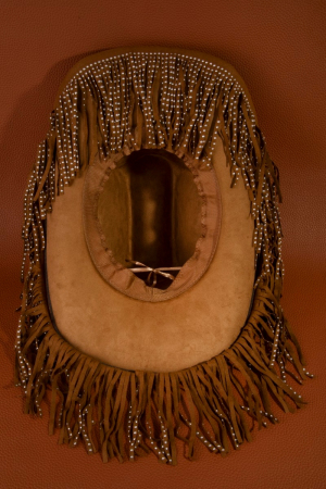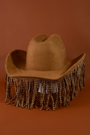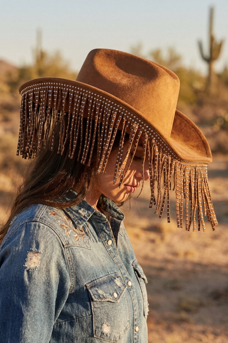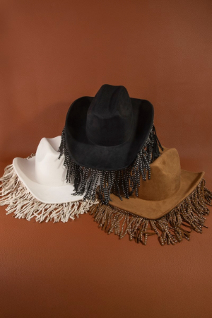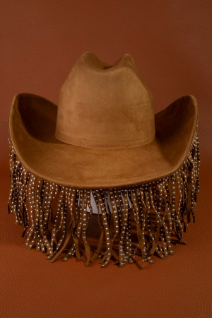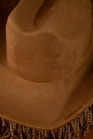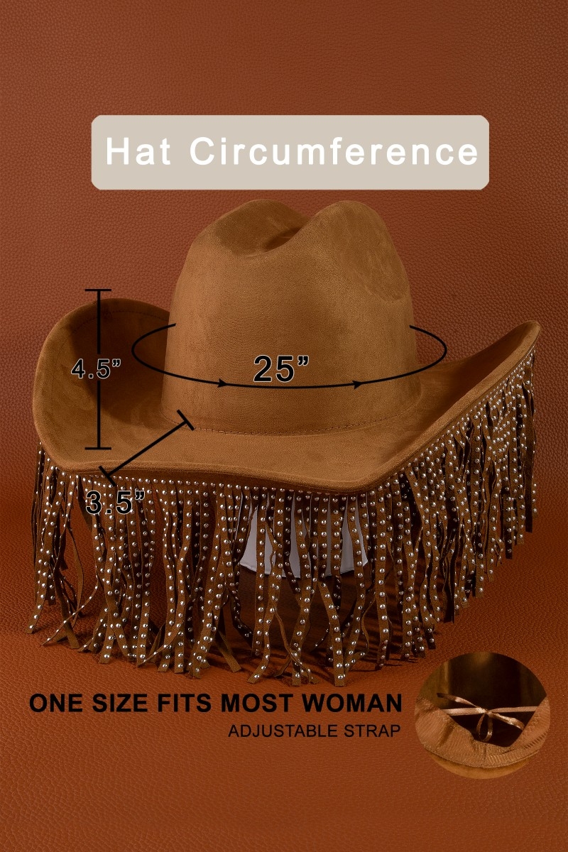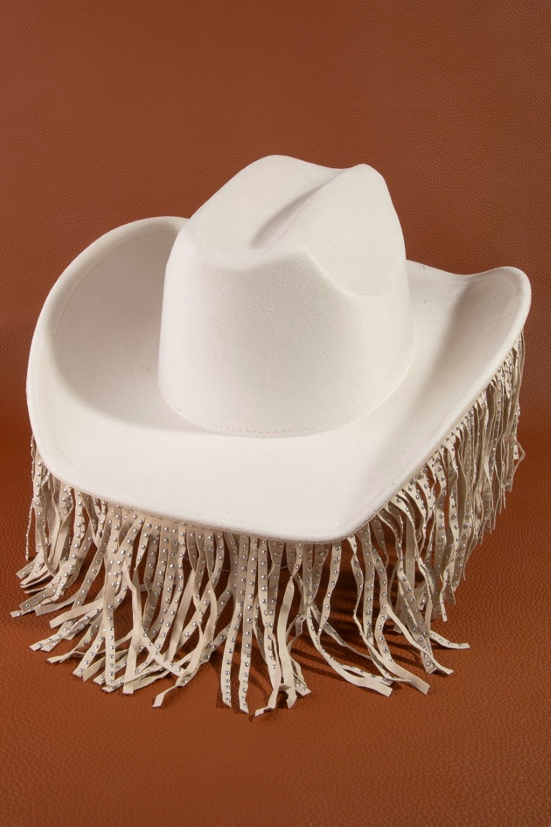 - This cowboy hat features a fashionable studded fringe trim western style. Experience refined sophistication with this understated yet stylish piece.