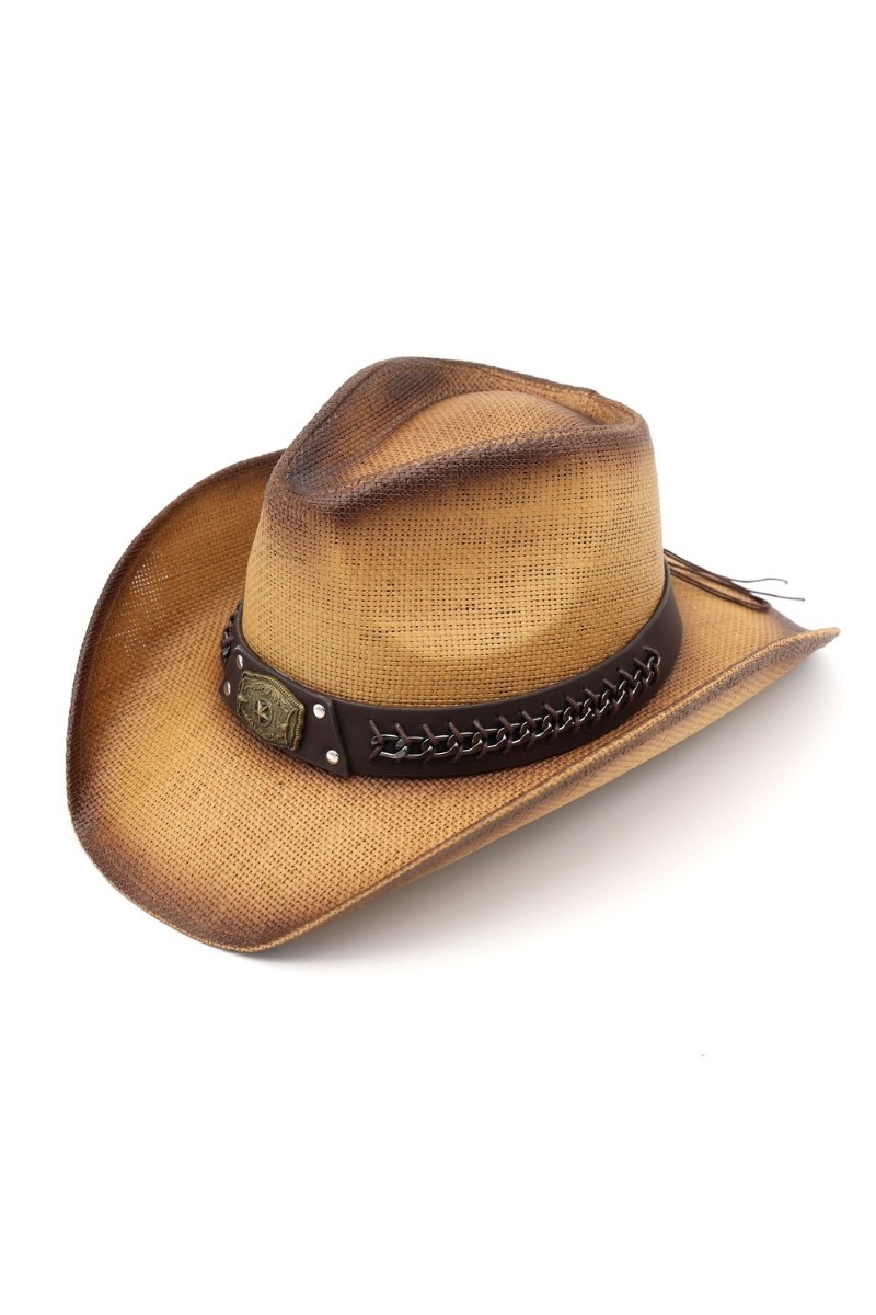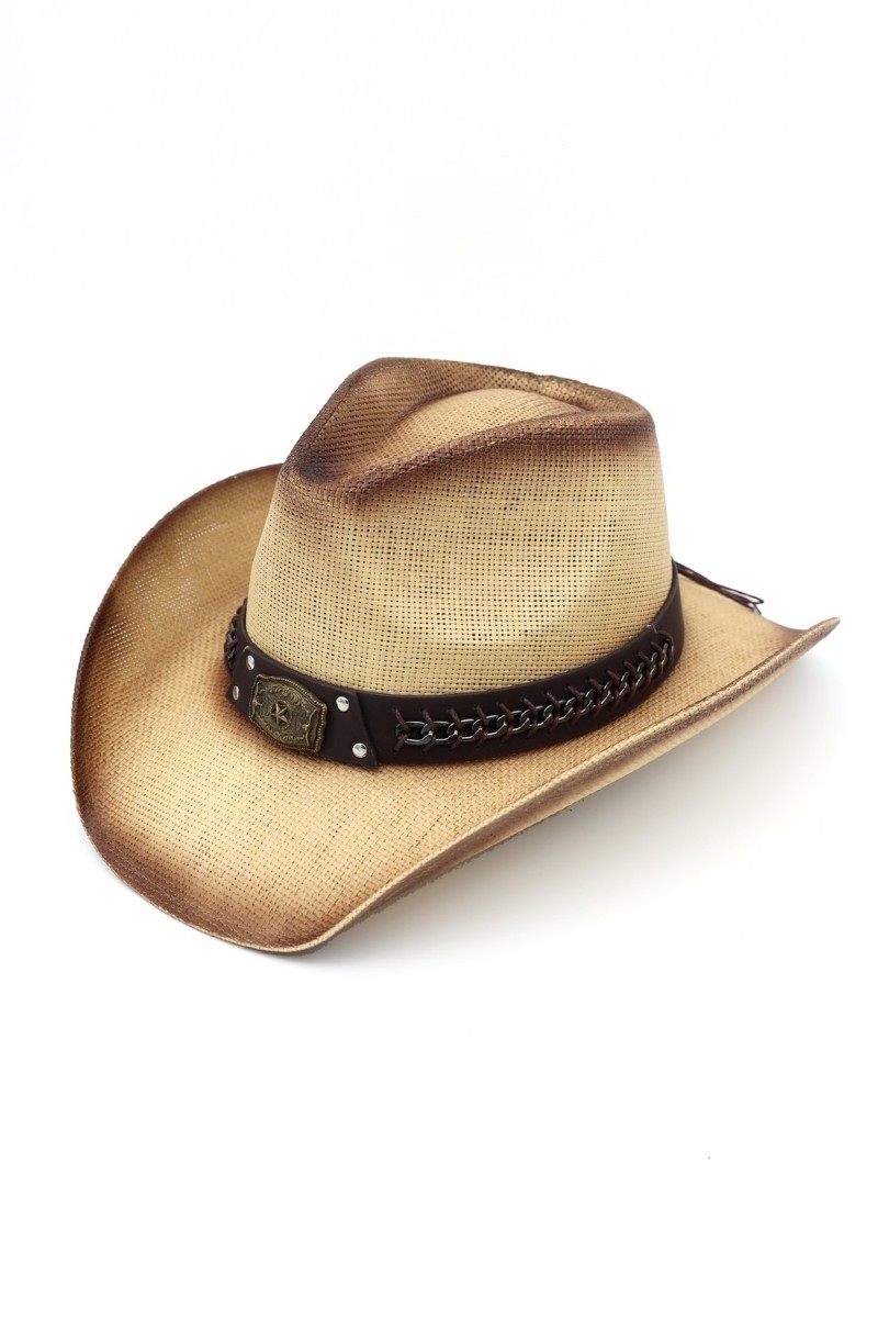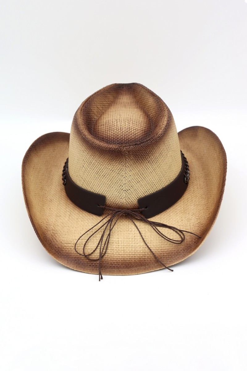 - This cowboy hat showcases a timeless western chain accent strap style. Explore a blend of classic charm and contemporary flair.