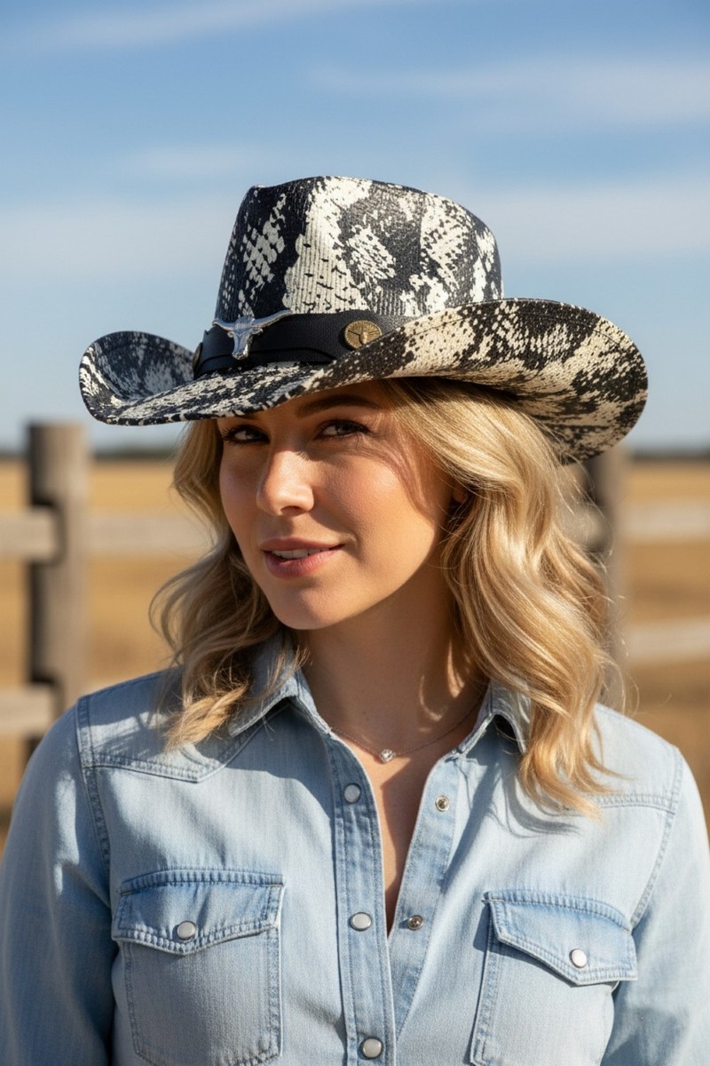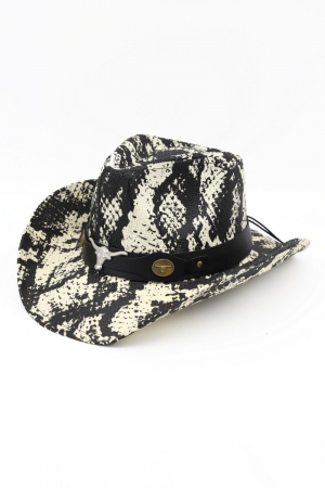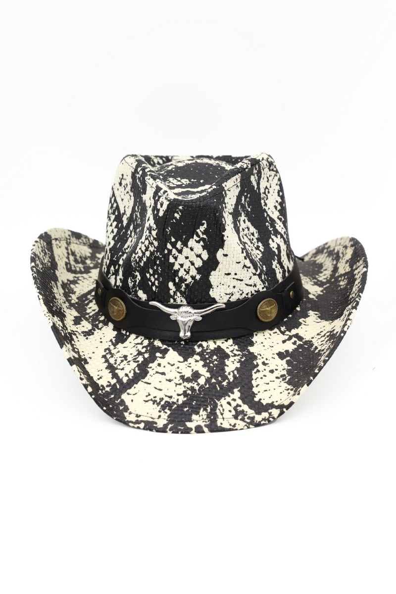- This cowboy hat introduces a unique western snake skin long horn charm style. Discover the perfect balance of subtlety and flair as this cowboy hat effortlessly completes your look.