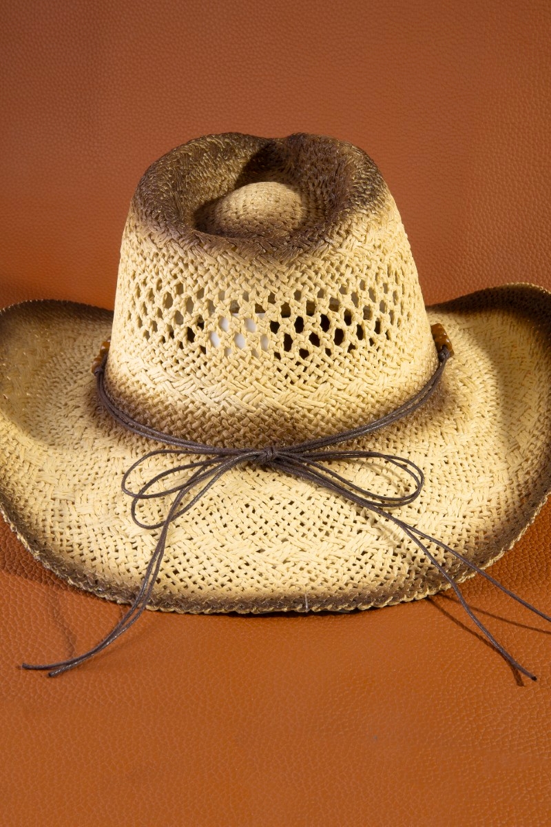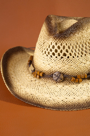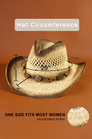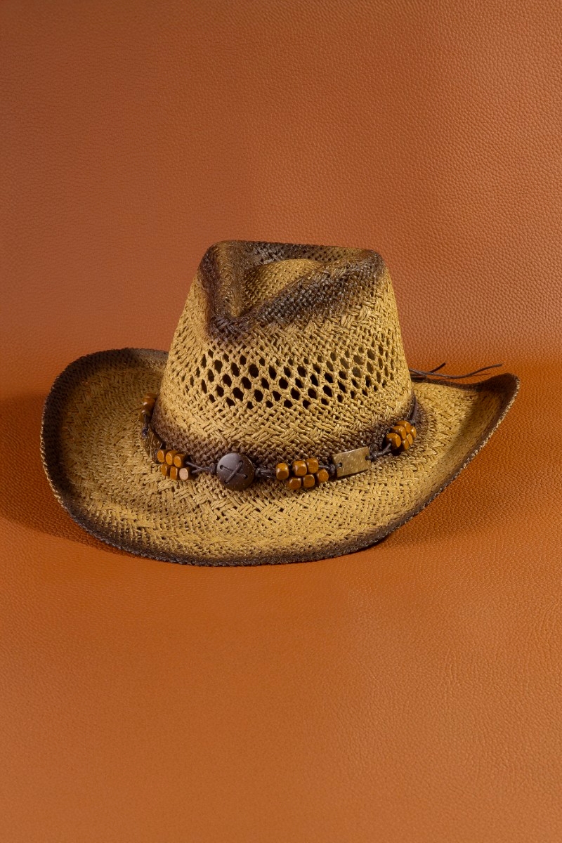 - This straw hat introduces a stunning wood beads strap cowboy style. Experience a subtle blend of modernity and classic charm as this straw hat effortlessly adorns your ensemble.