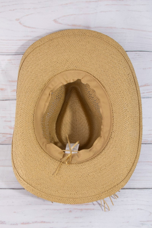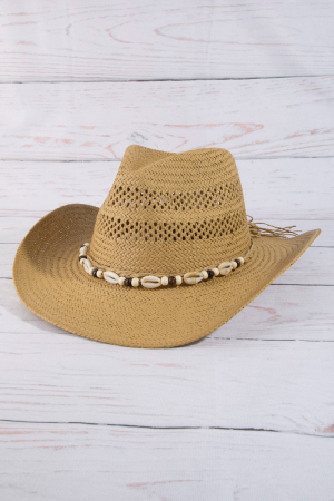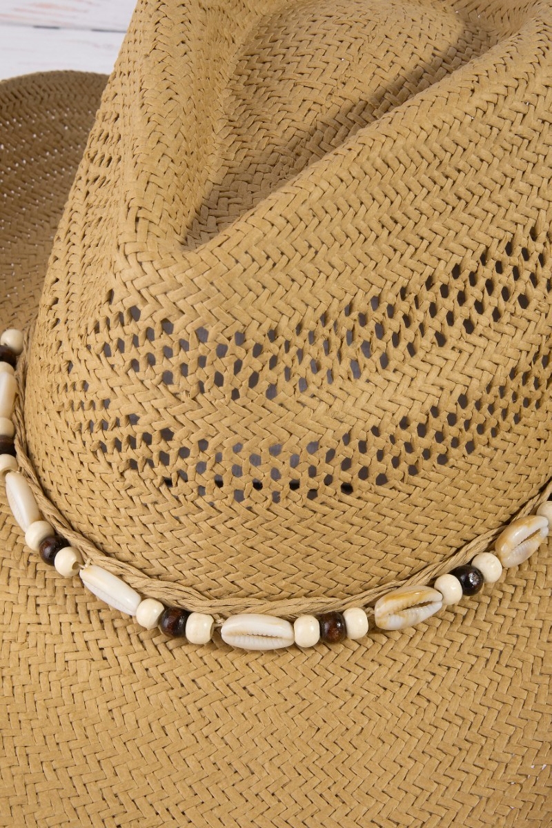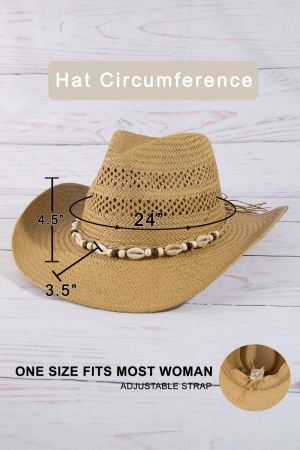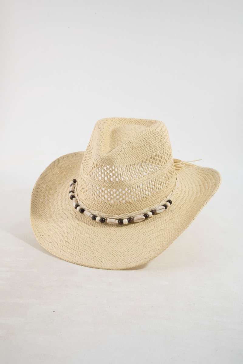 - This straw hat introduces a stunning cowrie shell cowboy style. Step into a world of refined taste as this straw hat effortlessly refines the details of your outfit.