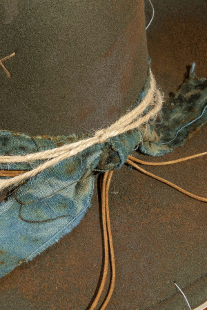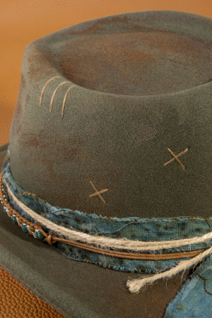 • This cowboy hat introduces a stunning fabric beaded distressed western style. Unveil a new dimension of sophistication as this cowboy hat effortlessly enhances the elegance of your ensemble.