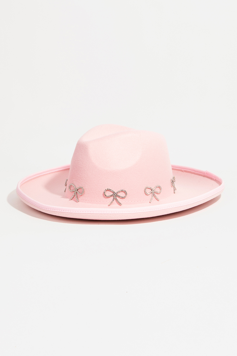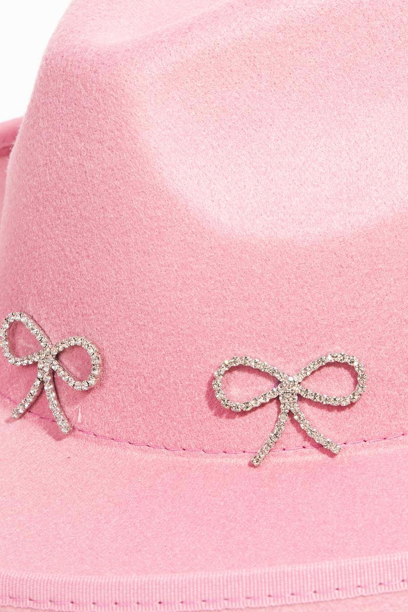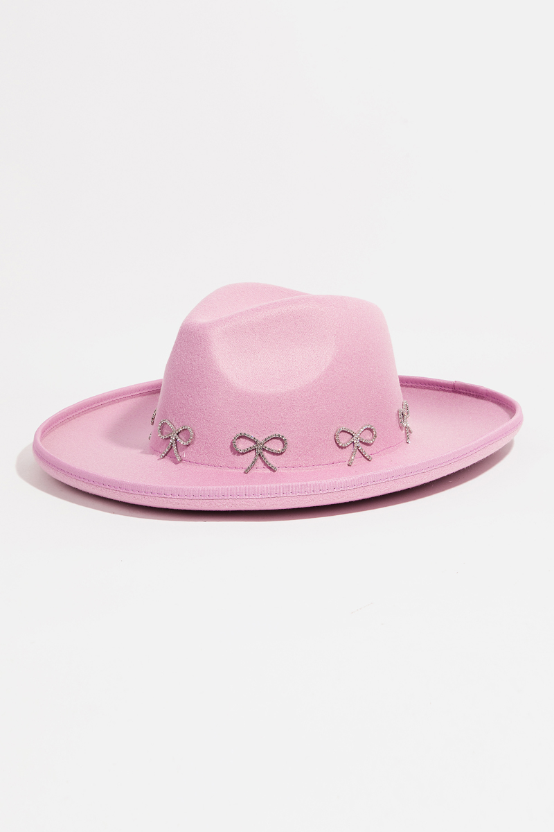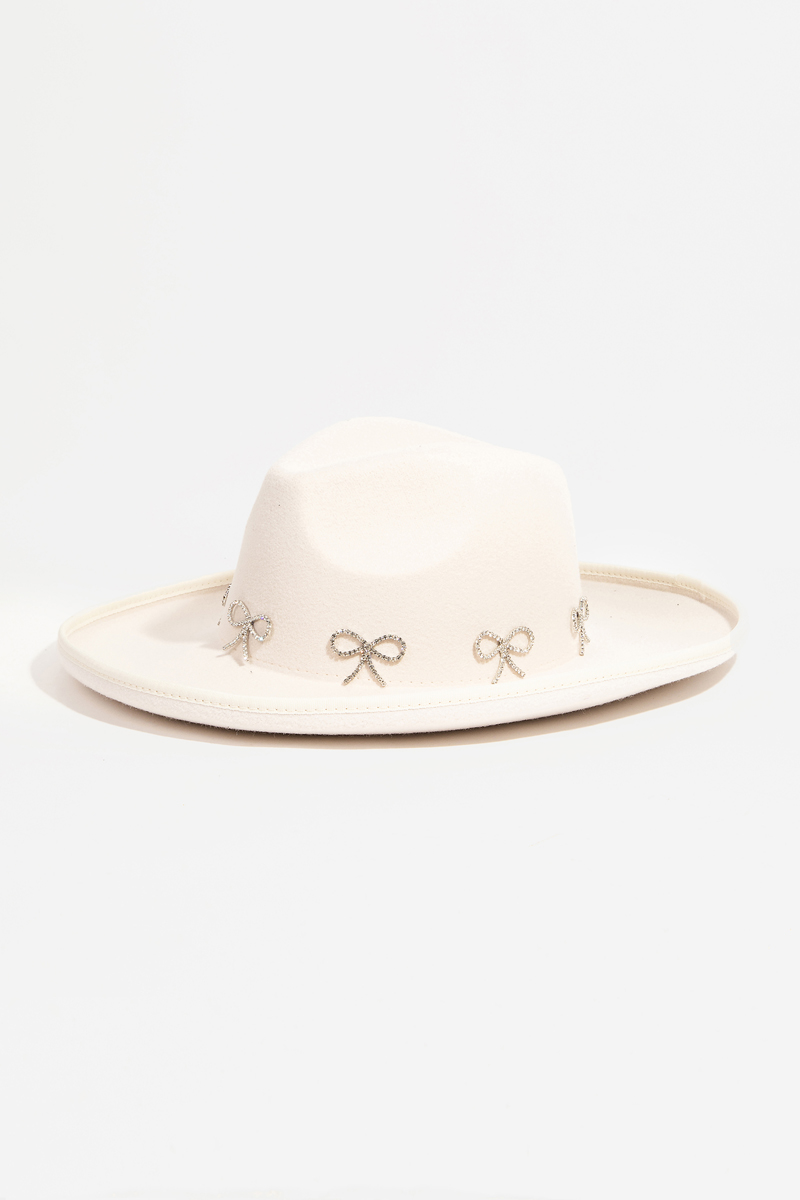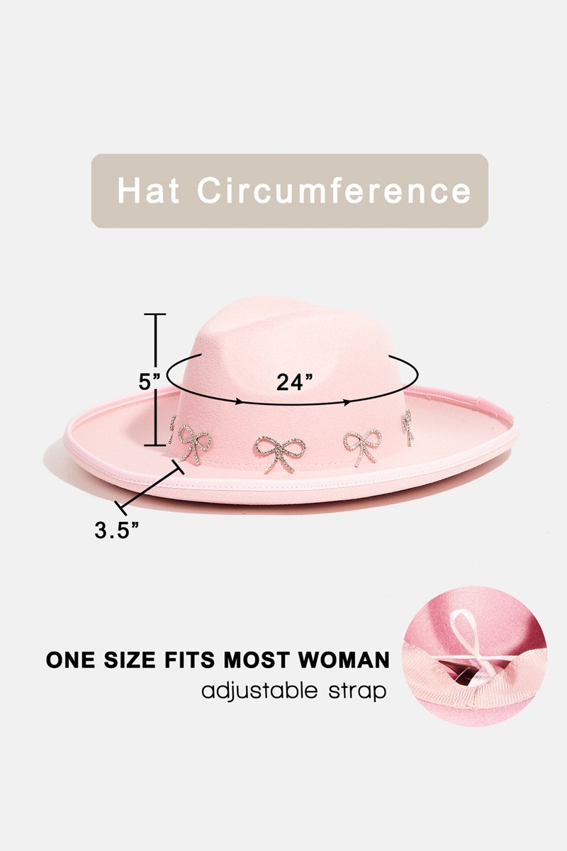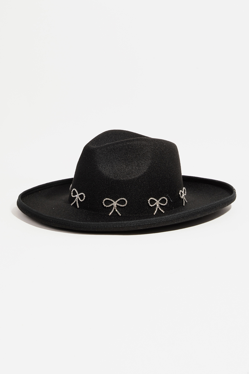 - This fedora hat introduces a stunning rhinestone ribbon bow charms style. Elevate your ensemble with this fedora hat that effortlessly captures the essence of refined fashion