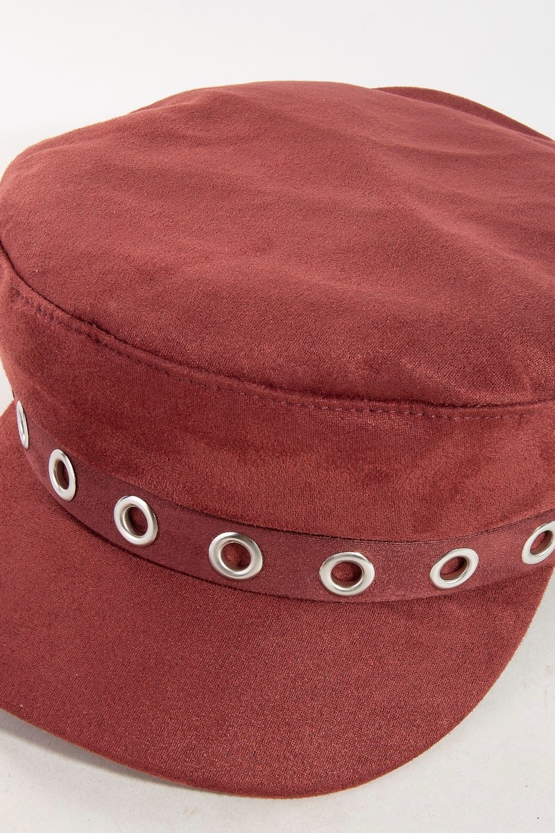 - This cap brings a unique grommet studded cabbie style. Indulge in the allure of exquisite craftsmanship as this cap effortlessly adds a touch of luxury to your attire.