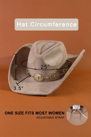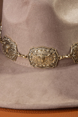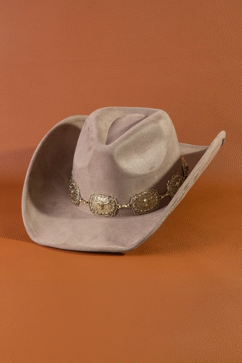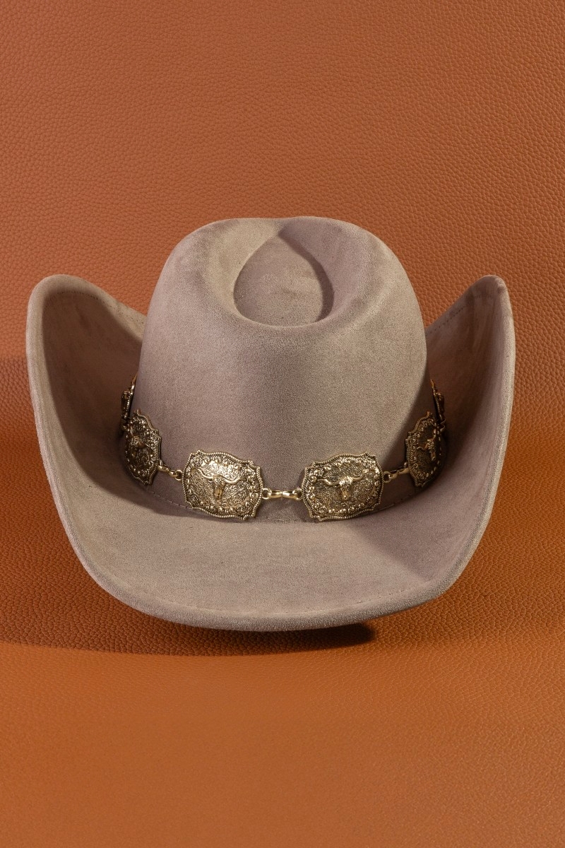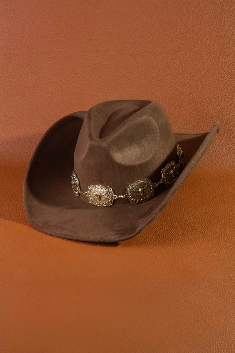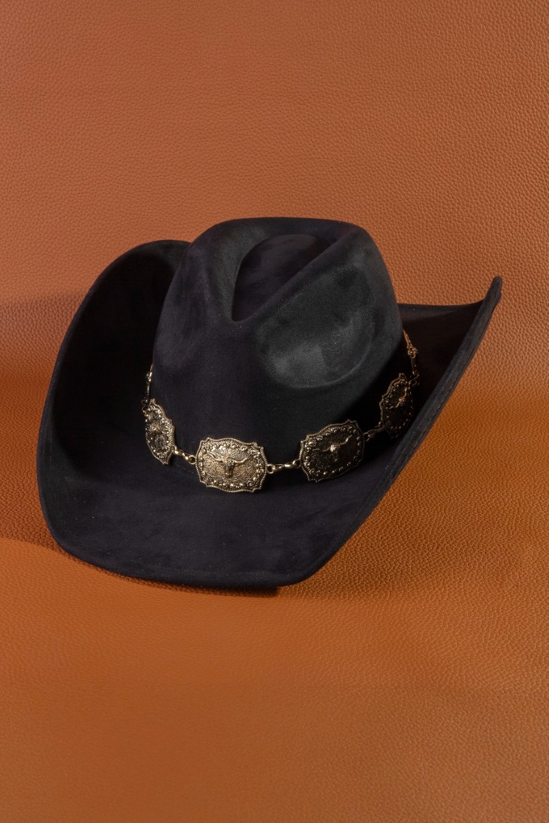 - This cowboy hat introduces a stunning longhorn concho chain western style. Delight in the intricate details that make this cowboy hat an essential element in expressing your fashion identity.