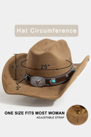- This cowboy hat introduces a stunning longhorn concho strap style. Unveil a new dimension of sophistication as this cowboy hat effortlessly enhances the elegance of your ensemble.