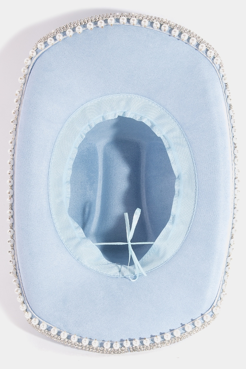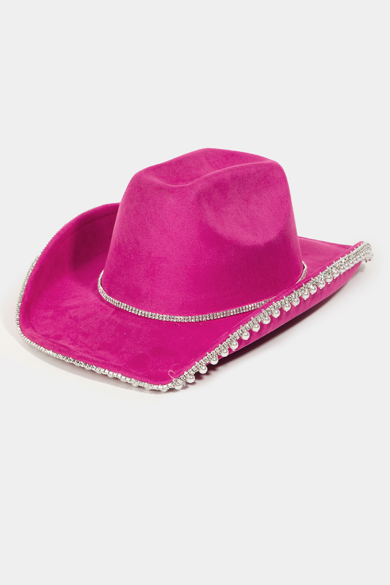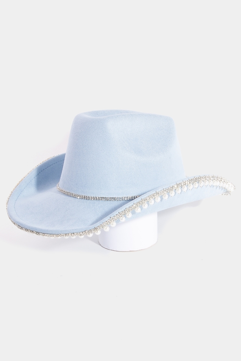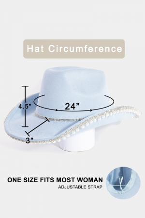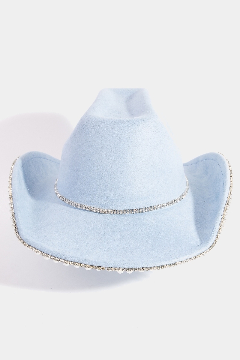 - This cowboy hat adds a modern rhinestone pearl trim style. Elevate your ensemble with this cowboy hat that effortlessly captures the essence of refined fashion.