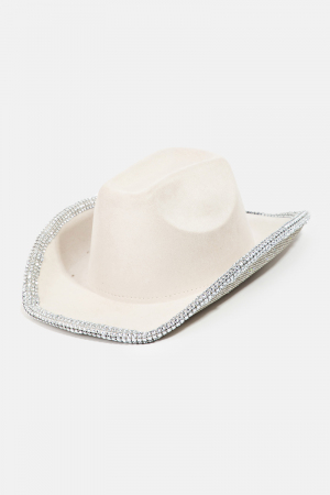 - This cowboy hat adds a modern rhinestone trim style. Experience a burst of creativity in accessorizing as this piece effortlessly sets the tone for your unique style. It includes a faux suede that is a synthetic fabric typically 100% polyester made to resemble genuine suede that is produced from a cow hide.