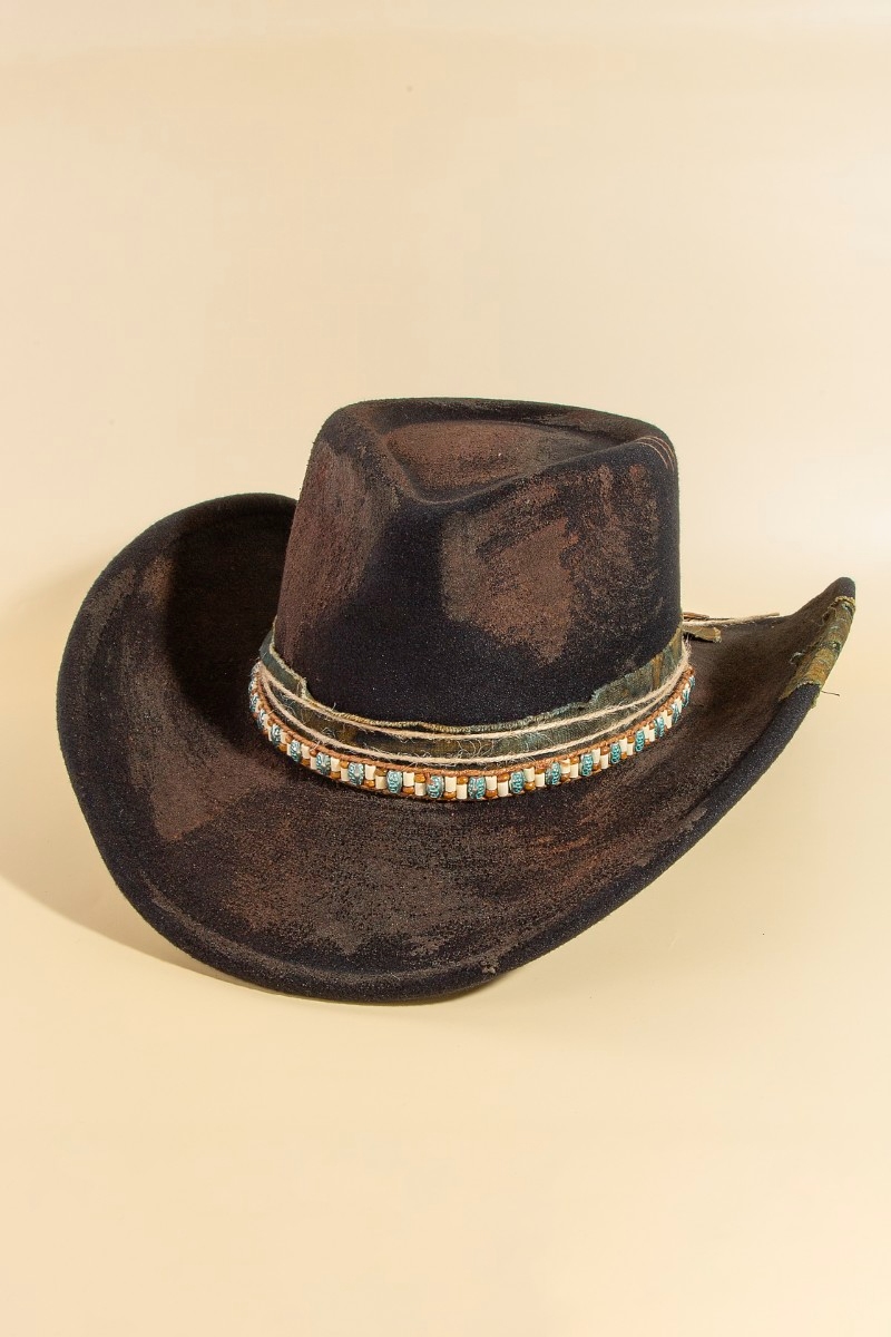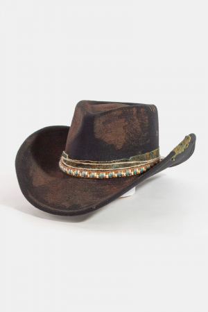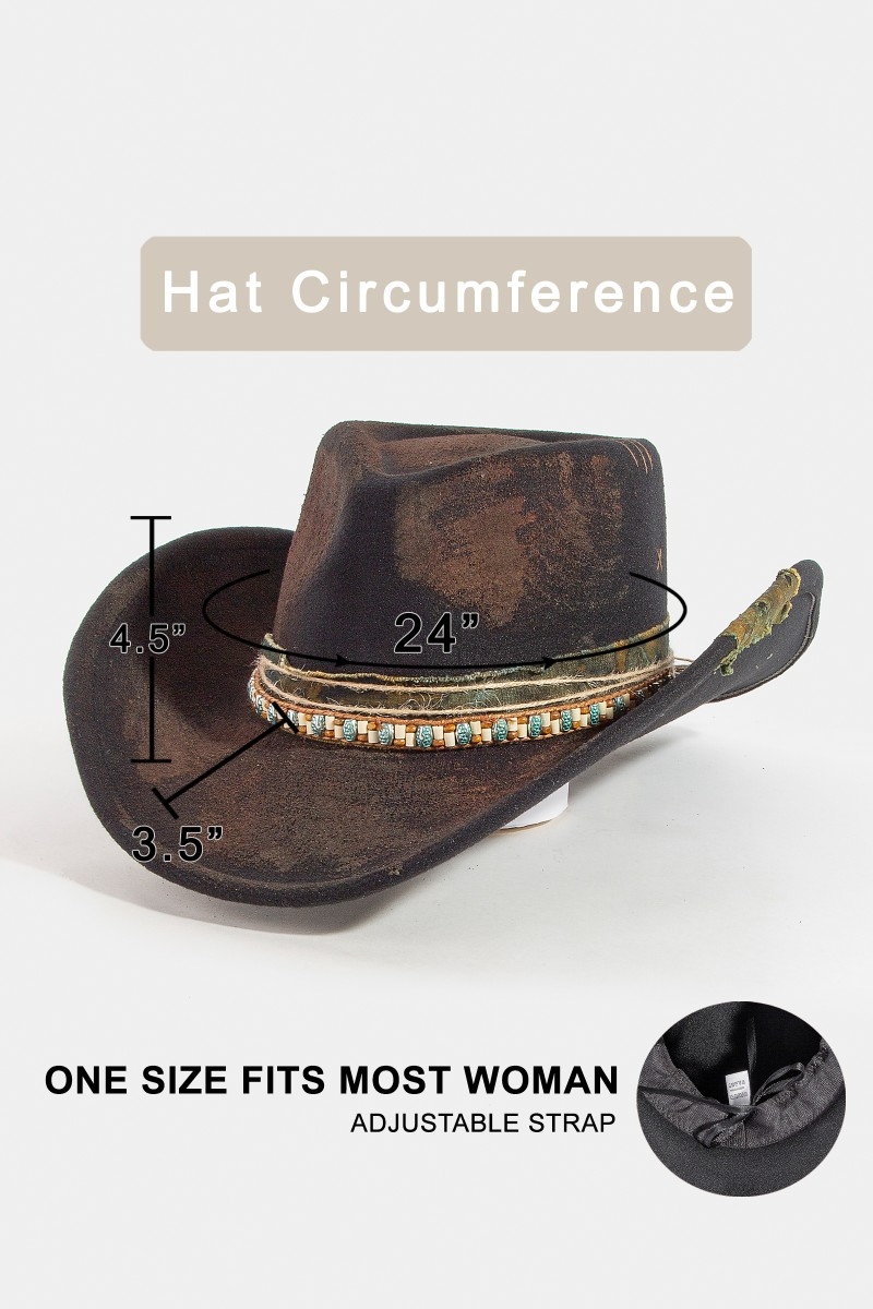 • This cowboy hat brings a unique rustic beaded strap western style. Savor the craftsmanship that goes beyond the ordinary, as this cowboy hat effortlessly captivates attention.