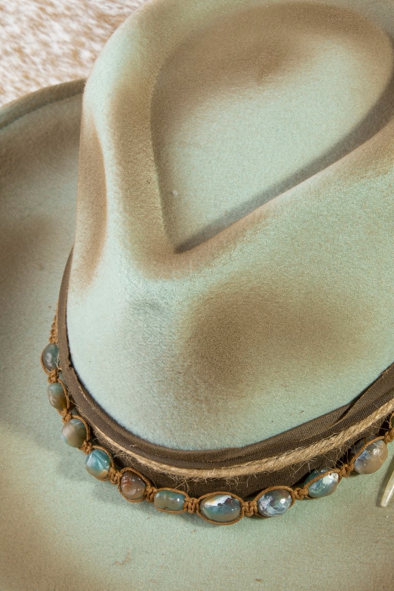 • This cowboy hat brings a luxurious semi precious stone bead western style. Unveil a new dimension of sophistication as this cowboy hat effortlessly enhances the elegance of your ensemble.